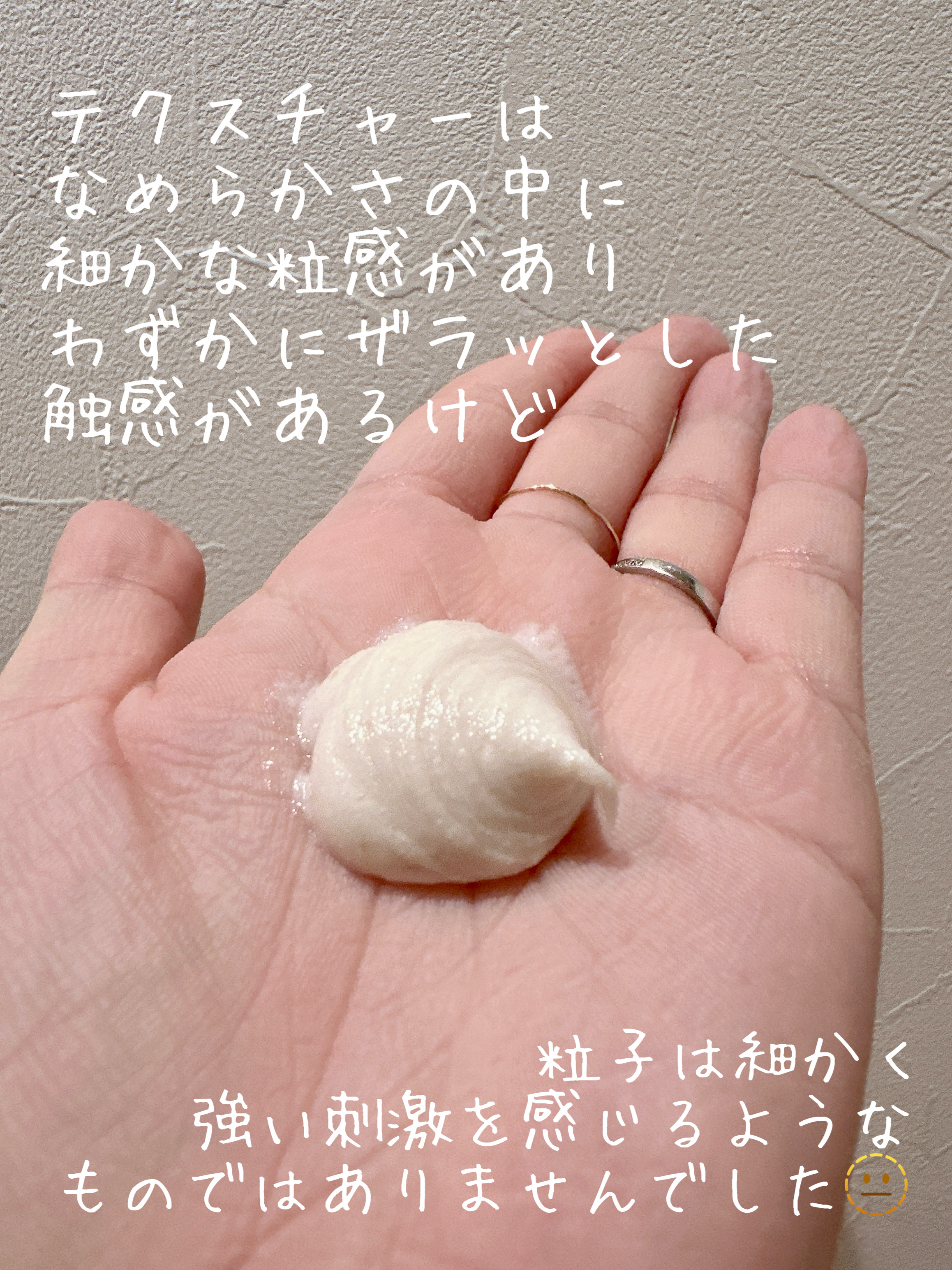 - <150ml> 水、グリセリン、ココイルイセチオン酸Na、ココベタイン、カオリン、デシルグルコシド、アーモンド種皮、パルミチン酸、1,2-ヘキサンジオール、ステアリン酸、ヘクトライト、ヤシ脂肪酸、塩化Na、BG、イセチオン酸Na、セルロース、サッカロミセス培養液、アスペルギルス培養物、コメ発酵液、香料、フィチン酸Na、ヤハズソウエキス、アカキナノキ樹皮エキス、アワ種子エキス、アルガニアスピノサ核油、クエン酸、サリチル酸、グルコノラクトン、ビフィズス菌発酵溶解質、ギョリュウバイ葉エキス、エチルヘキシルグリセリン、ツボクサエキス、トリ(カプリル酸/カプリン酸)グリセリル、ティーツリー葉エキス、水添レシチン、合成ヒト遺伝子組換ペンタペプチド-19、合成ヒト遺伝子組換オリゴペプチド-9、合成ヒトオクタペプチド-4、合成ヒト遺伝子組換デカペプチド-7、セラミドNP