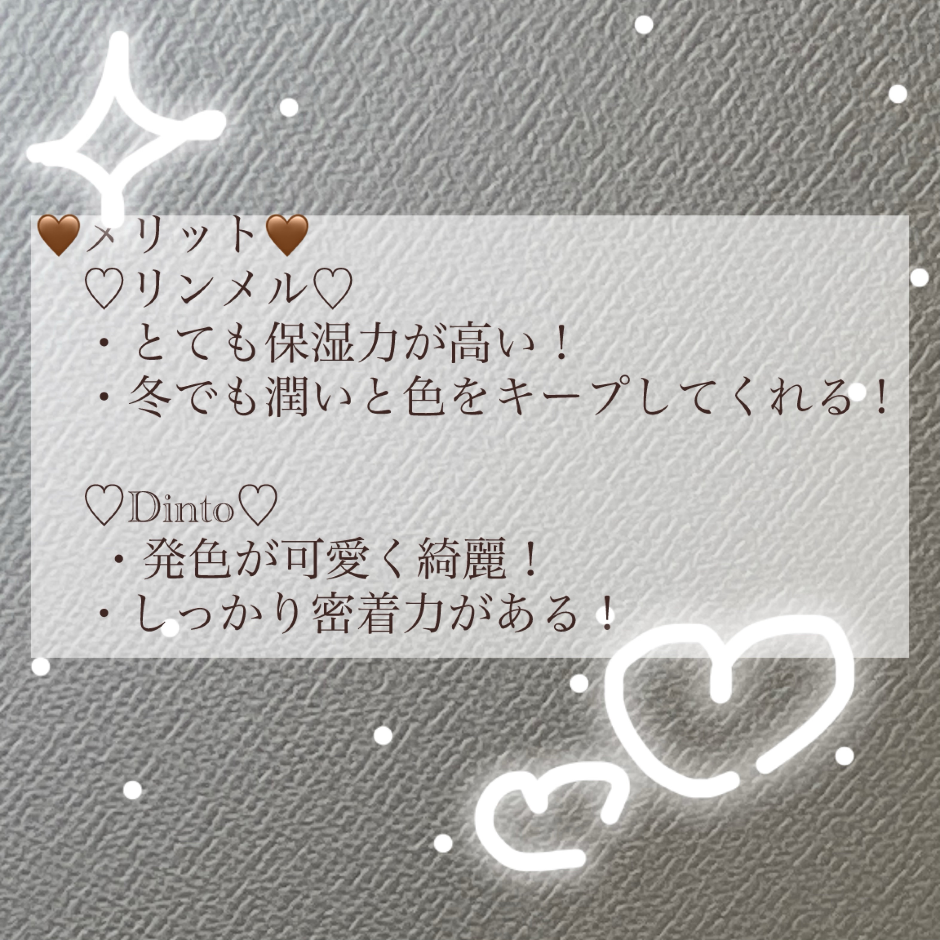 【商品の特徴】つけたての色が長持ちするから色落ちしにくい! 【使用感】ツヤ感があってツルツルしてるので唇にフィットしてくれる! 【良いところ】発色が綺麗でしかも色持ちするから長時間のお出かけにも◎