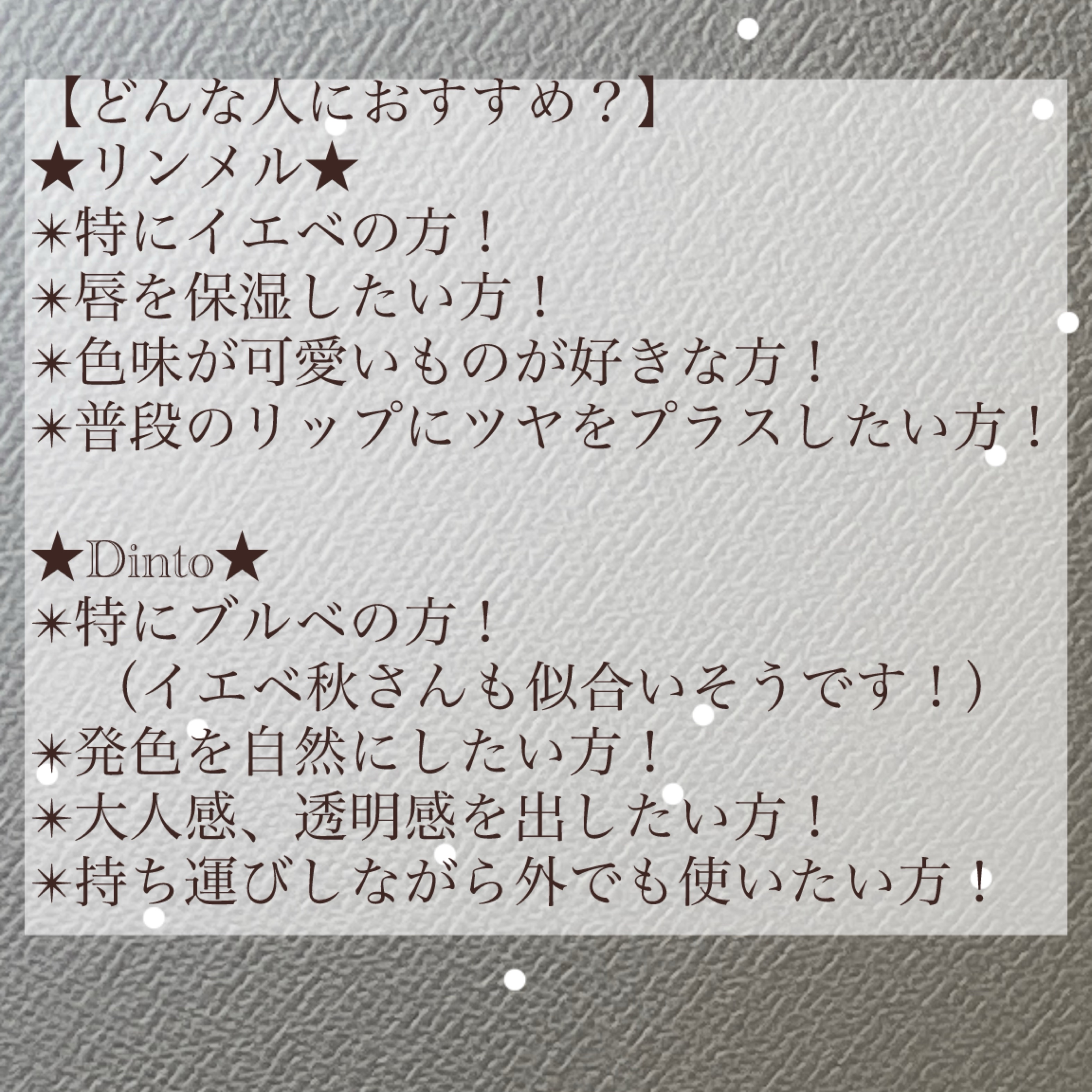 | 口紅・グロス・リップライナーランキング第73位 | すごくサラサラしていて、べたつかないのでリップクリームみたいな感覚で使える♪ | 詳細を見る |