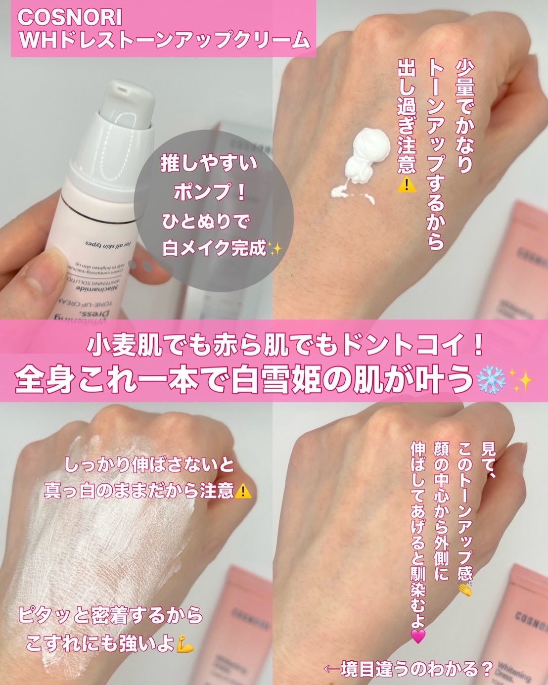 \COSNORIWHドレストーンアップクリーム/ひと塗りで流行りの白肌メイクが完成できるトーンアップクリーム🤍全身に使用可能で、季節関係なく肌見せ部分をトーンアップ🫶✨超密着のさらさらの仕上がりで、服への色移りもないのが嬉しい💯ベースメイクの...