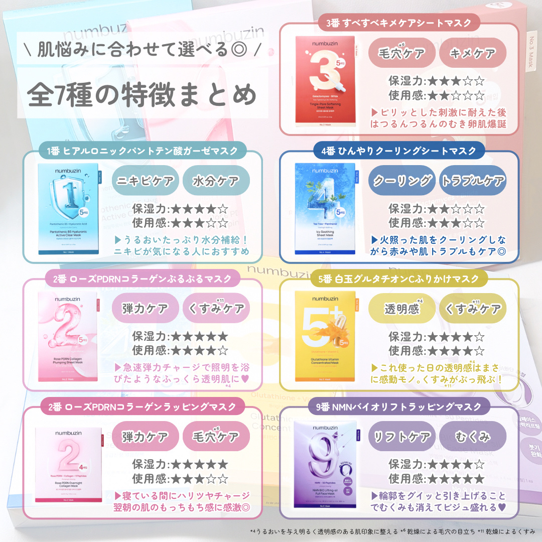 \\全種類比較//ナンバーズインの大人気アイテム!お肌の悩みに合わせて選べる全7種類のシートマスクをレビューします〜🫶★ヒアルロニックパンテトン酸ガーゼマスク★ローズPDRNコラーゲンぷるぷるマスクローズ★ローズPDRNコラーゲンラッピングマ...