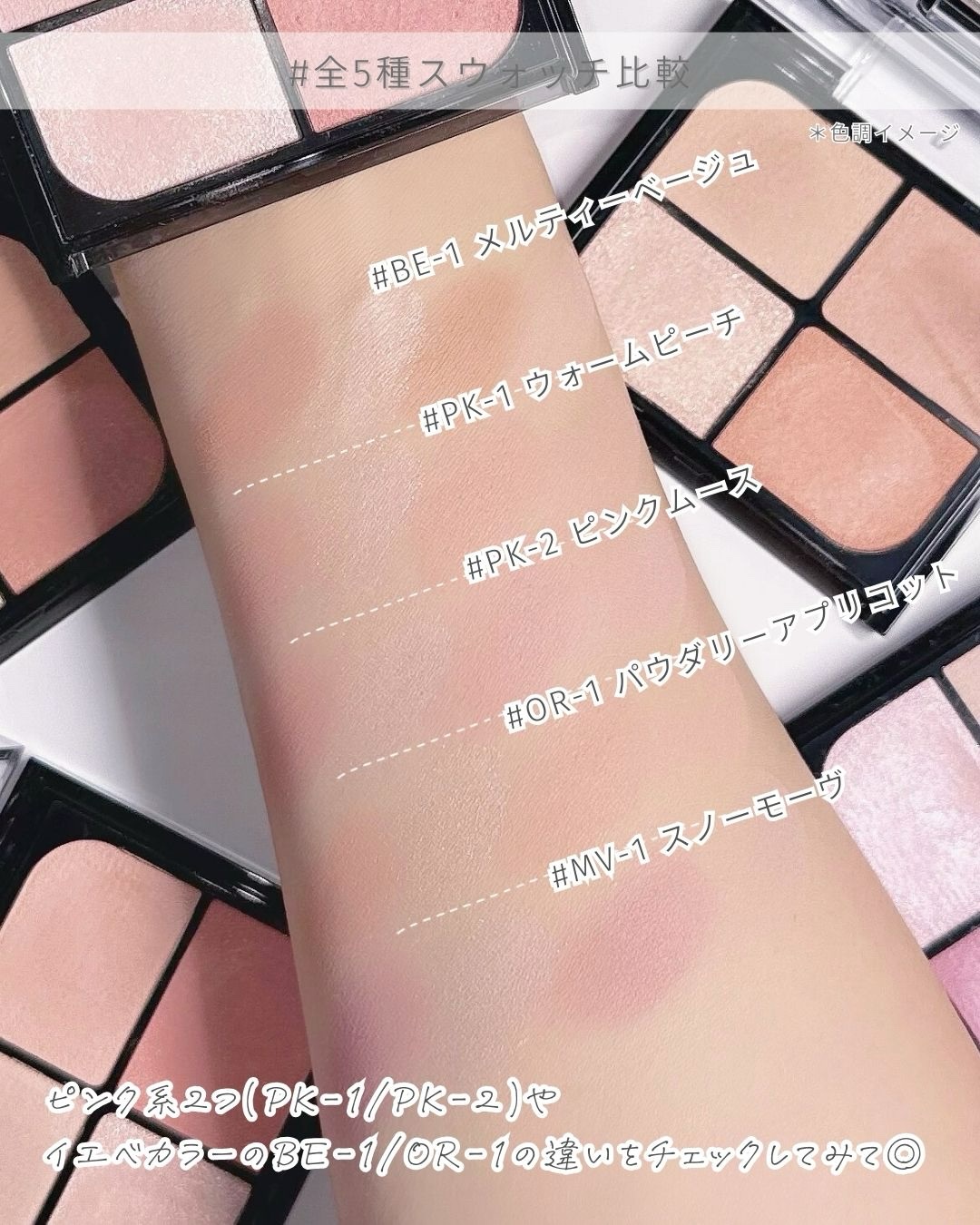 - <BE-1 メルティーベージュ> マイカ、合成フルオロフロゴパイト、ジメチコン、シリカ、ジエチルヘキサン酸ネオペンチルグリコール、ジフェニルシロキシフェニルトリメチコン、イソノナン酸イソトリデシル、ダイマージリノール酸(フィトステリル/イソステアリル/セチル/ステアリル/ベヘニル)、リンゴ酸ジイソステアリル、コーンスターチ、窒化ホウ素、ステアリン酸亜鉛、(ジメチコン/ビニルジメチコン)クロスポリマー、ミリスチン酸Mg、トコフェロール、ミリスチン酸亜鉛、イソステアリン酸ソルビタン、水添ポリイソブテン、エチルパラベン、メチルパラベン、デヒドロ酢酸Na、(+/-)アルミナ、グンジョウ、コンジョウ、パルミチン酸、ラウロイルアスパラギン酸Na、塩化亜鉛、酸化チタン、酸化亜鉛、酸化鉄、水酸化Al、硫酸Ba、トリイソステアリン酸イソプロピルチタン、酸化スズ、ホウケイ酸(Ca/Al)、黄4、赤202、赤226 <MV-1 スノーモーヴ> マイカ、合成フルオロフロゴパイト、ジメチコン、シリカ、ジエチルヘキサン酸ネオペンチルグリコール、ジフェニルシロキシフェニルトリメチコン、イソノナン酸イソトリデシル、ダイマージリノール酸(フィトステリル/イソステアリル/セチル/ステアリル/ベヘニル)、リンゴ酸ジイソステアリル、コーンスターチ、窒化ホウ素、ステアリン酸亜鉛、(ジメチコン/ビニルジメチコン)クロスポリマー、ミリスチン酸Mg、トコフェロール、ミリスチン酸亜鉛、イソステアリン酸ソルビタン、水添ポリイソブテン、エチルパラベン、メチルパラベン、デヒドロ酢酸Na、(+/-)アルミナ、グンジョウ、コンジョウ、パルミチン酸、ラウロイルアスパラギン酸Na、塩化亜鉛、酸化チタン、酸化亜鉛、酸化鉄、水酸化Al、硫酸Ba、トリイソステアリン酸イソプロピルチタン、酸化スズ、ホウケイ酸(Ca/Al)、黄4、赤202、赤226 <OR-1 パウダリーアプリコット> マイカ、合成フルオロフロゴパイト、ジメチコン、シリカ、ジエチルヘキサン酸ネオペンチルグリコール、ジフェニルシロキシフェニルトリメチコン、イソノナン酸イソトリデシル、ダイマージリノール酸(フィトステリル/イソステアリル/セチル/ステアリル/ベヘニル)、リンゴ酸ジイソステアリル、コーンスターチ、窒化ホウ素、ステアリン酸亜鉛、(ジメチコン/ビニルジメチコン)クロスポリマー、ミリスチン酸Mg、トコフェロール、ミリスチン酸亜鉛、イソステアリン酸ソルビタン、水添ポリイソブテン、エチルパラベン、メチルパラベン、デヒドロ酢酸Na、(+/-)アルミナ、グンジョウ、コンジョウ、パルミチン酸、ラウロイルアスパラギン酸Na、塩化亜鉛、酸化チタン、酸化亜鉛、酸化鉄、水酸化Al、硫酸Ba、トリイソステアリン酸イソプロピルチタン、酸化スズ、ホウケイ酸(Ca/Al)、黄4、赤202、赤226 <PK-1 ウォームピーチ> マイカ、合成フルオロフロゴパイト、ジメチコン、シリカ、ジエチルヘキサン酸ネオペンチルグリコール、ジフェニルシロキシフェニルトリメチコン、イソノナン酸イソトリデシル、ダイマージリノール酸(フィトステリル/イソステアリル/セチル/ステアリル/ベヘニル)、リンゴ酸ジイソステアリル、コーンスターチ、窒化ホウ素、ステアリン酸亜鉛、(ジメチコン/ビニルジメチコン)クロスポリマー、ミリスチン酸Mg、トコフェロール、ミリスチン酸亜鉛、イソステアリン酸ソルビタン、水添ポリイソブテン、エチルパラベン、メチルパラベン、デヒドロ酢酸Na、(+/-)アルミナ、グンジョウ、コンジョウ、パルミチン酸、ラウロイルアスパラギン酸Na、塩化亜鉛、酸化チタン、酸化亜鉛、酸化鉄、水酸化Al、硫酸Ba、トリイソステアリン酸イソプロピルチタン、酸化スズ、ホウケイ酸(Ca/Al)、黄4、赤202、赤226 <PK-2 ピンクムース> マイカ、合成フルオロフロゴパイト、ジメチコン、シリカ、ジエチルヘキサン酸ネオペンチルグリコール、ジフェニルシロキシフェニルトリメチコン、イソノナン酸イソトリデシル、ダイマージリノール酸(フィトステリル/イソステアリル/セチル/ステアリル/ベヘニル)、リンゴ酸ジイソステアリル、コーンスターチ、窒化ホウ素、ステアリン酸亜鉛、(ジメチコン/ビニルジメチコン)クロスポリマー、ミリスチン酸Mg、トコフェロール、ミリスチン酸亜鉛、イソステアリン酸ソルビタン、水添ポリイソブテン、エチルパラベン、メチルパラベン、デヒドロ酢酸Na、(+/-)アルミナ、グンジョウ、コンジョウ、パルミチン酸、ラウロイルアスパラギン酸Na、塩化亜鉛、酸化チタン、酸化亜鉛、酸化鉄、水酸化Al、硫酸Ba、トリイソステアリン酸イソプロピルチタン、酸化スズ、ホウケイ酸(Ca/Al)、黄4、赤202、赤226