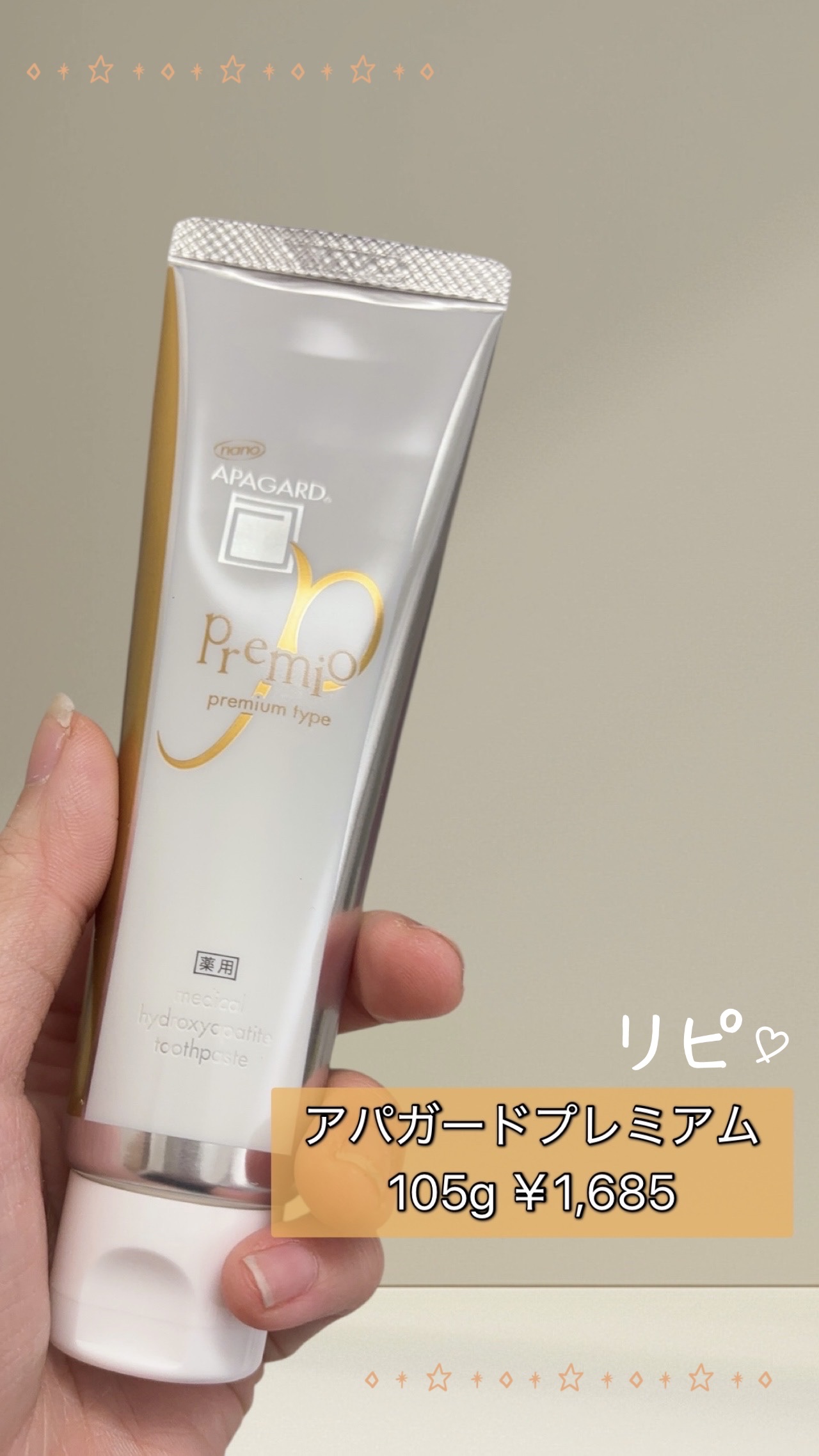 - 【医薬部外品】 独自成分「薬用ハイドロキシアパタイト」がエナメル質を整えてむし歯を予防。アパガードはエナメル質の健康を保つことで自然な白い歯に導く美白歯みがきブランド。アパガードプレミオは「薬用ハイドロキシアパタイト」を高配合(スタンダードタイプ比)。プレミアムケアでときめく白い歯に。 <ライトミント> ●サンギ独自の薬用成分ナノ粒子「薬用ハイドロキシアパタイト」を高配合したプレミアムタイプ。※Mプラス、スモーキン比 ●歯の再石灰化率、白色度もアップ。 ●歯垢を吸着除去し、歯のエナメル質の目に見えない傷を埋め、ミネラル欠損部(初期むし歯)を再石灰化するナノ<mHAP>の3つの働きで、むし歯を予防。 ●パール成分(加水分解コンキオリン液)配合。 <エクストラミント> ●強めのミントがお好みの方におススメ!ミント強めの「エクストラミント」フレーバー。 ●サンギ独自の薬用成分ナノ粒子「薬用ハイドロキシアパタイト」を高配合したプレミアムタイプ。※Mプラス、スモーキン比 ●歯垢を吸着除去、エナメル質表面の目に見えない傷を埋めてなめらかに、エナメル質から溶け出したミネラルを補給(再石灰化)する、という薬用ハイドロキシアパタイトの3つの作用でむし歯を予防。 ●パール成分(加水分解コンキオリン液)を追加したブライトニング処方