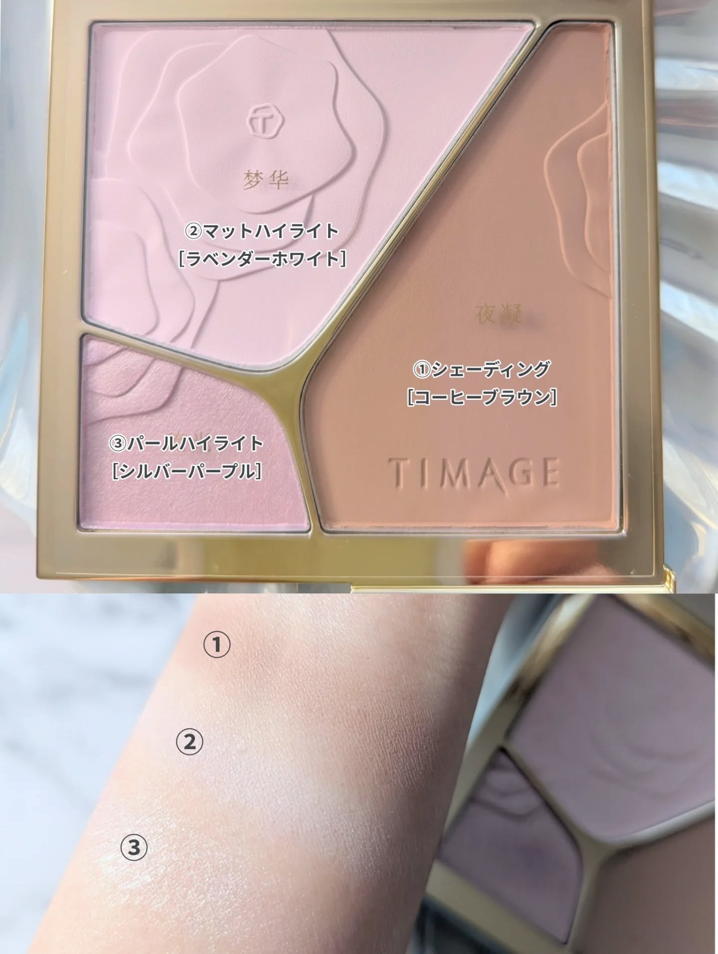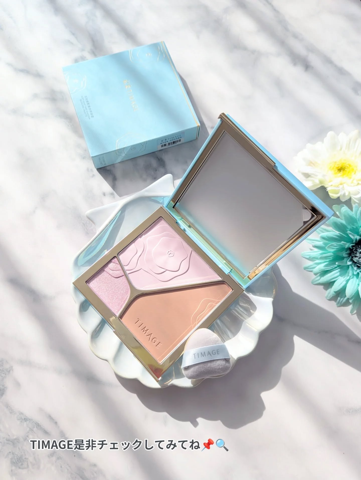 Timageのハイライト・シェーディングパレットを使用したよ!シェーディング、マットハイライト、パールハイライトが1つになったパレットなの🎨 肌のトーンに合わせて選べる2カラー展開だよ☝️ 💛01日影柔(イエベにおすすめ)💙02月暉清(ブルベにおすすめ) サラッとした着け心地で、自然に馴染んでくれるから浮いた感じはなく簡単に立体感のあるお顔になれるよ!