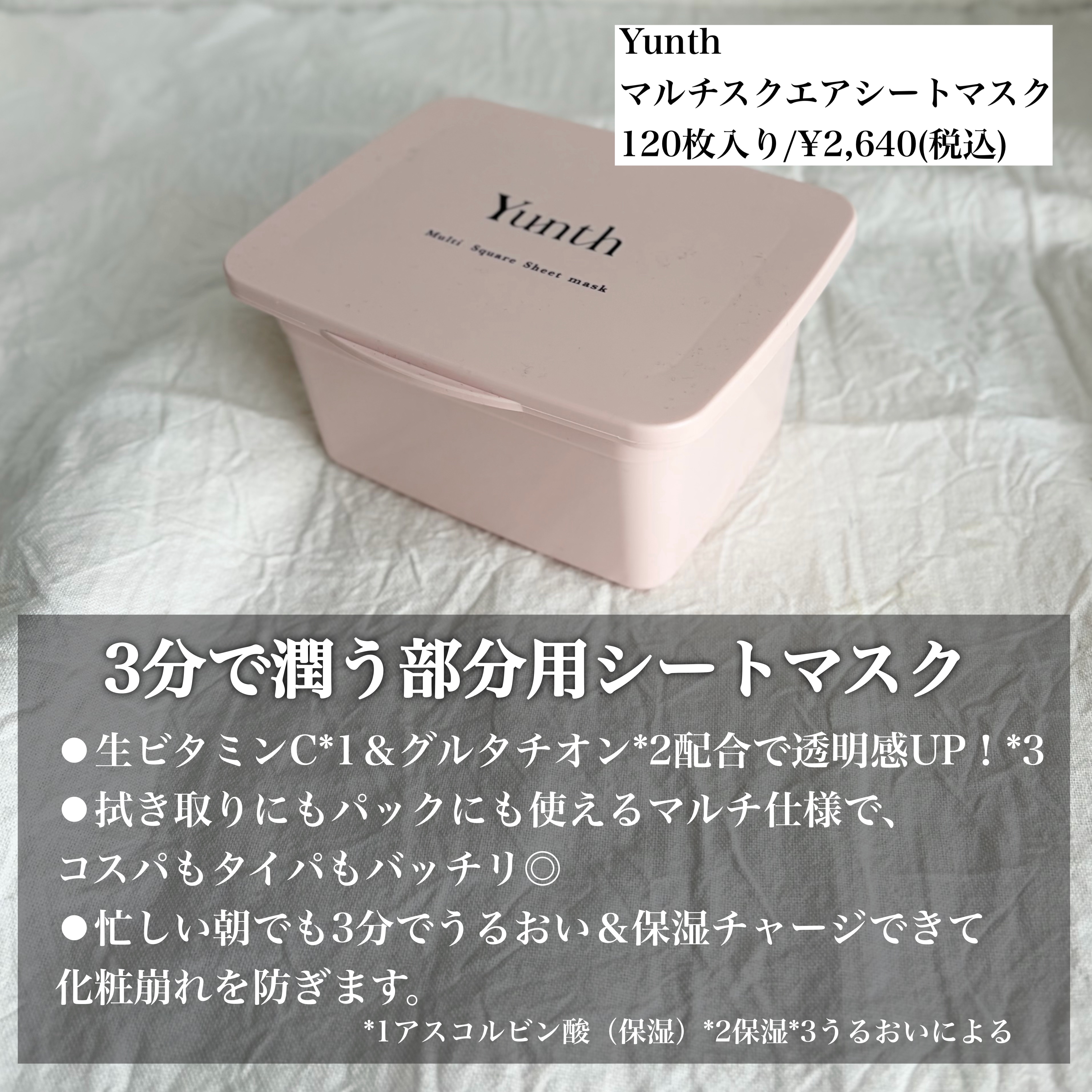 - â çãã¿ãã³CÃã°ã«ã¿ããªã³ã§ãèŒãããµããéææãžãäžããïŒãªãã®Wã¢ãããŒã Yunthã§ããªãã¿ã®çãã¿ãã³Câ»1ã«å ããã°ã«ã¿ããªã³â»2ãã»ã©ããâ»3ããã¢ã«ãã³é žâ»4ãªã©èã®ä¿æ¹¿ãšéææâ»5ãåºäžãããæåã ãã§ãªãããµãåãçšéãšããŠæ¬¡äžä»£åAHAâ»6ãèãæŽããã¢ãŒã©ã€ã³é žâ»7ãããã¯ãµãšãã¹â»8ãé åãããããèæ©ã¿ã«å€è§çã«ã¢ãããŒãããåŠæ¹èšèšã§ãã â»1 ã¢ã¹ã³ã«ãã³é ž â»2 ã°ã«ã¿ããªã³ (ä¿æ¹¿) â»3 ã»ã©ããNPãã»ã©ããNGãã»ã©ããAP (ä¿æ¹¿) â»4 ãã¢ã«ãã³é žNa (ä¿æ¹¿) â»5 ããããã«ãã â»6 ã°ã«ã³ããã¯ã¿ãŒ/ããããçºé µæ¶² (æŽè) â»7 ã¢ãŒãã€ã«ãžã°ãªã·ã³K (æŽè) â»8 ããã¯ãµè/èãšãã¹ (æŽè) â¡ãã£ã·ã䜿ãã120æå ¥ããæ¯æ¥äœ¿ããããâã¡ãããâã¹ã¯ãšã¢åœ¢ç¶ æ¶²å«ã¿ããããæã§ç°¡åã«ã¡ãããã·ãŒããæ¡çšã é¡å šäœã¯ãã¡ãããå°éŒ»ã»ç®å ã»éŠå ãªã©æ°ã«ãªãããŒãã«ãµããšè²Œãããšãã§ããŸããã奜ã¿ã®ãµã€ãºã«ã¡ãã£ãŠãTãŸãŒã³ãç®å ãªã©ã®ãã³ãã€ã³ãã±ã¢ã«ãæé©ã§ãããã£ã·ã䜿ãã倧容é120æå ¥ãã â¢é«å¯çïŒé«ä¿ã®ã·ãŒãã§å¿ããæã§ã3åã§æœ€ããã£ãŒãžã çµ¶åŠãªåã¿ã®é«å¯çã·ãŒããèã«ãŽãããšãã£ããããçŸå®¹æ¶²ã®ããããããã£ããå±ããŸãããã£ã3åã§èãã¿ãã¿ãããæŽããã¡ã€ã¯ã®ããªãã¢ãããå€ã®ã¡ã€ã¯åŽ©ããé²ããããããŸãããæ¯æ¥ã®ã¹ãã³ã±ã¢ããã£ãšæè»œã«ããééæéã«è³¢ãã±ã¢ãããããšããæ¹ã«ãŽã£ããã®æçã¢ã€ãã ã§ãã â£èã«ãããã6ã€ã®ããªãŒ ãã©ãã³ããšã¿ããŒã«ãé±ç©æ²¹ãç³æ²¹ç³»ç颿޻æ§å€ãéŠæãçè²æãããªãŒãæ¯æ¥äœ¿ãããããã䜿ãå¿å°ã远æ±ããŸããã