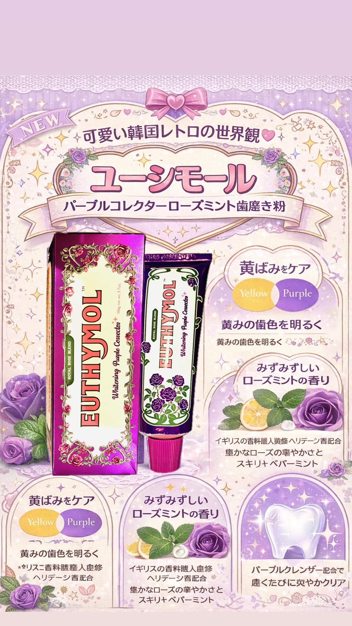 EUTHYMOLパープルコレクターローズミント歯磨き粉🌹限定のローズミントフレーバーを試してみました💜まずパッケージからすでに可愛い!ロイヤル感のあるクラシックなデザインで、洗面台に置くだけでちょっと気分が上がります👑ユーシモールといえば爽快...