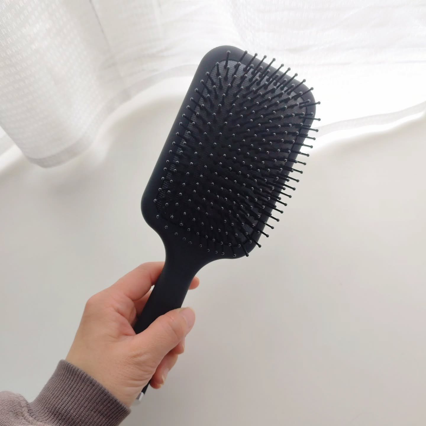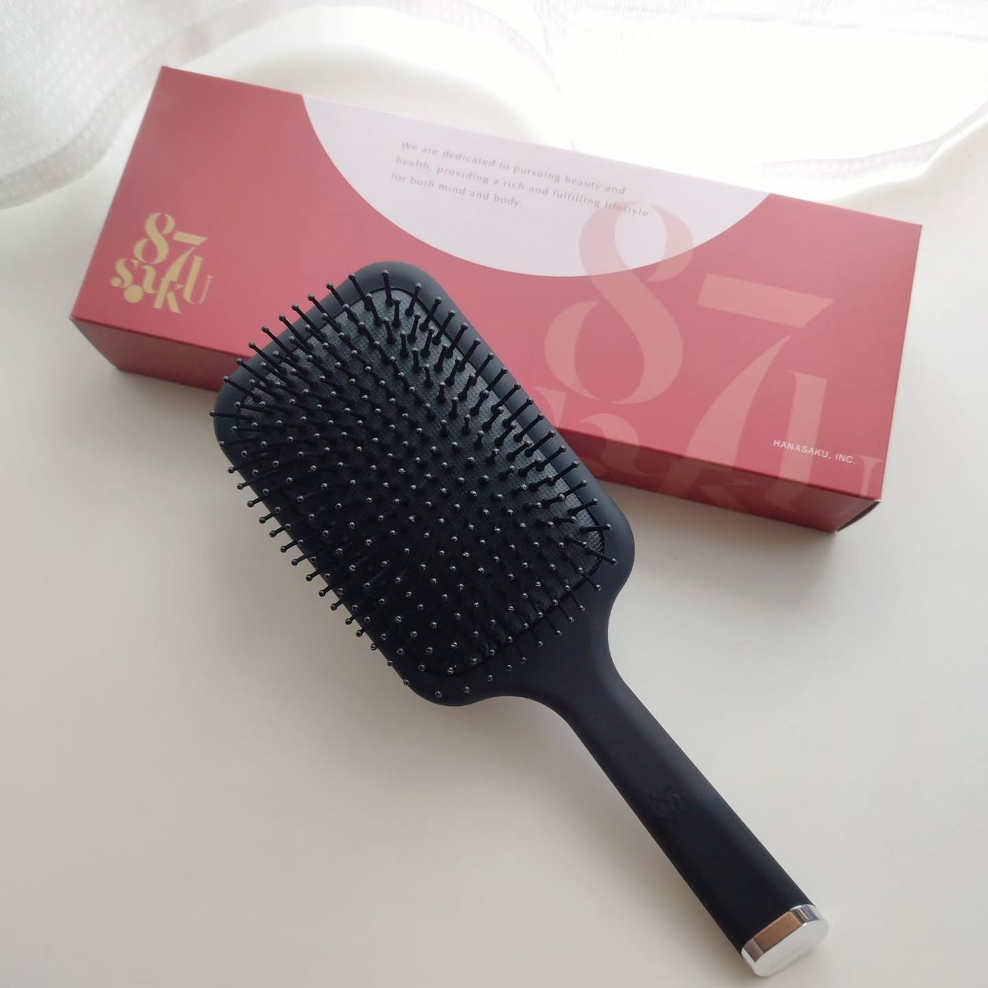 87saku(ハナサク)パドルブラシ広いクッション面が頭皮をやさしい使い心地で刺激。髪の流れを整えながら摩擦を抑え、ツヤとまとまりを守り、夜のリラックスタイムにも、朝のスタイリング前にも。髪と頭皮を整える、癒しの時間を。【広いクッションで頭皮...