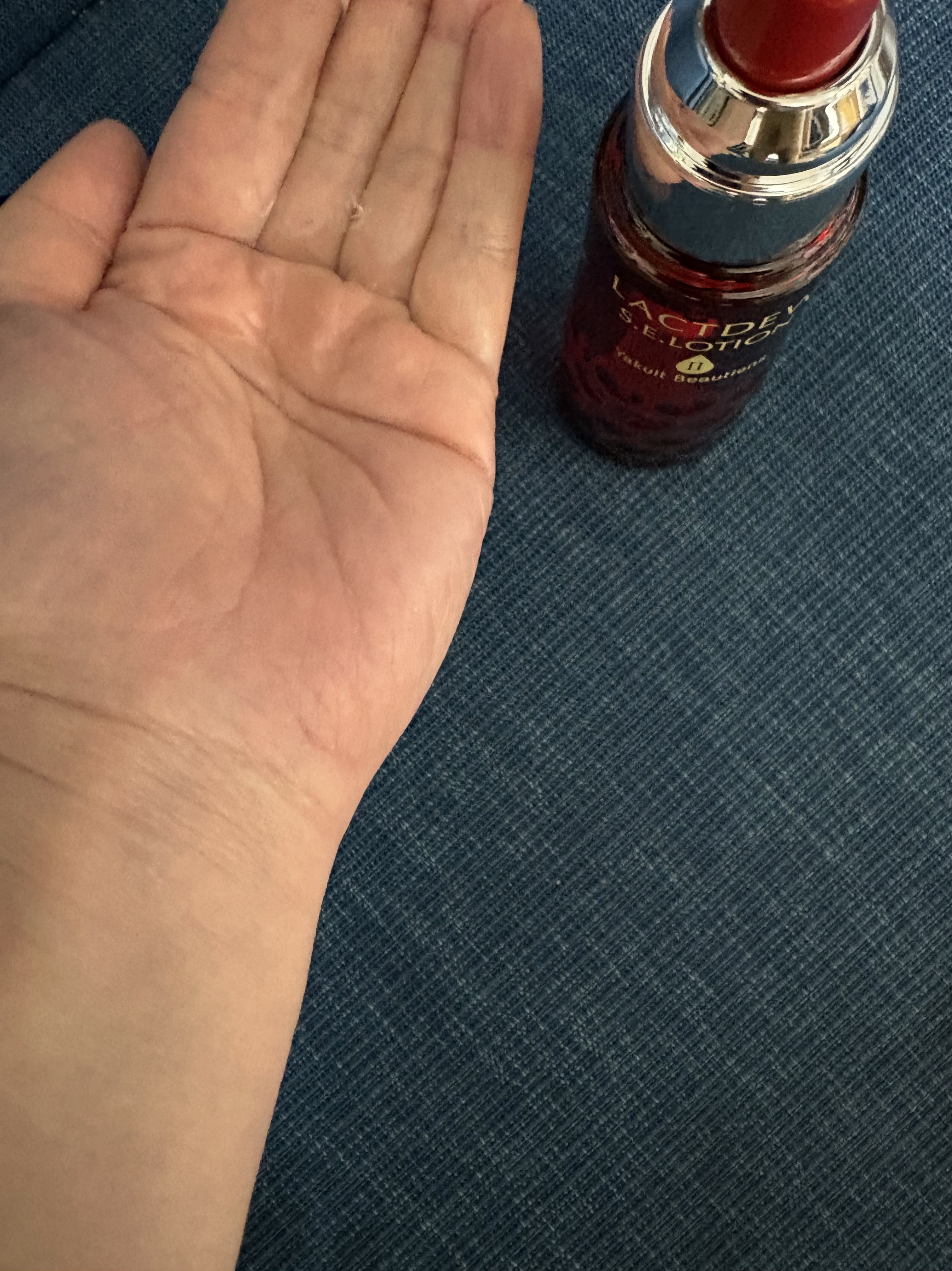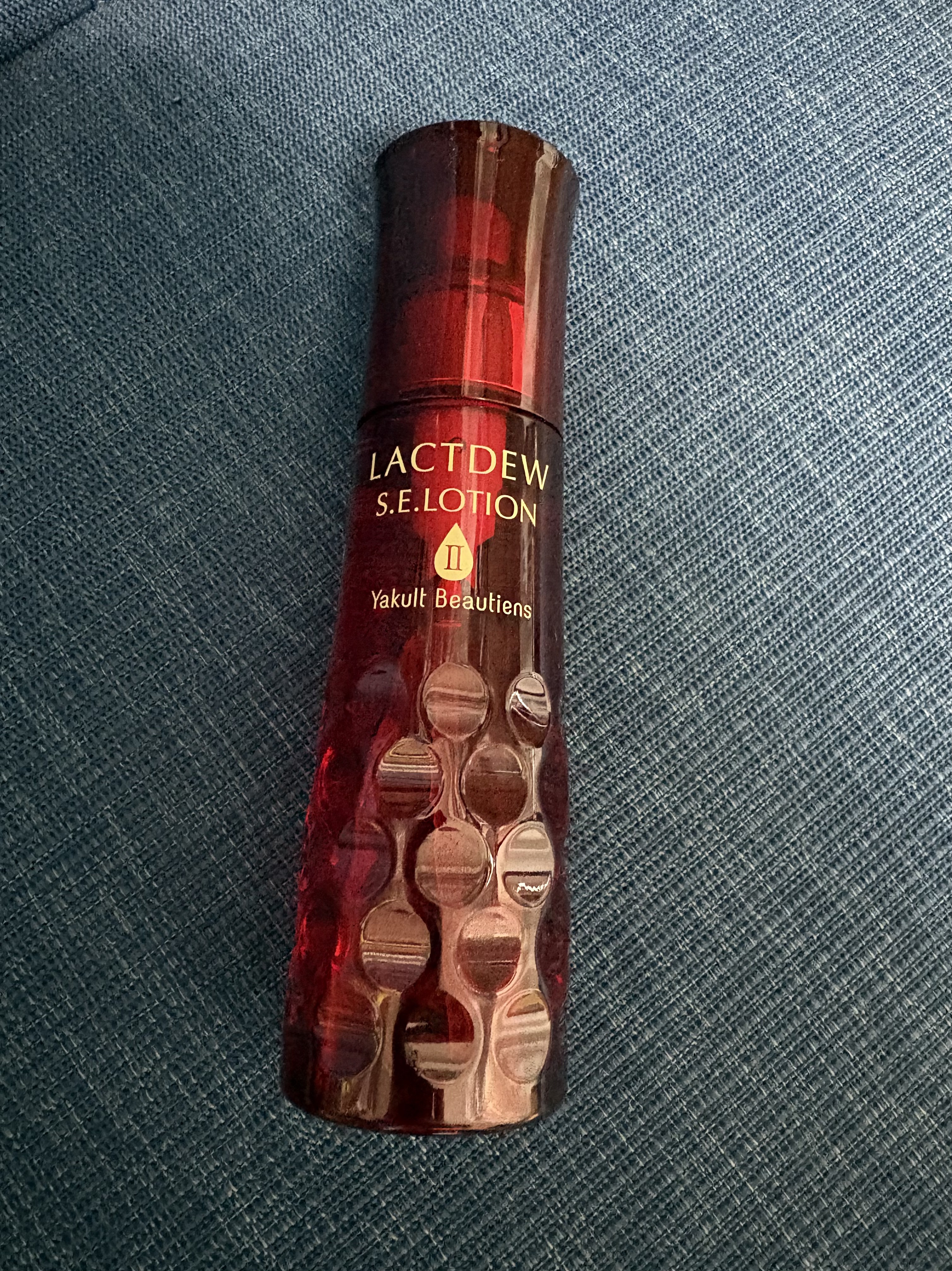 華やかな赤いボトルが素敵。 光に当たるとキラキラしてすごく綺麗なんです✨ こちらはあのヤクルトがつくった化粧水。乳酸菌がつくりだすうるおい成分に、お肌を守る働きがあるんだそう! なじませるとしっとりもっちりするような感触。 ベタつきがほぼ残らないところも◎