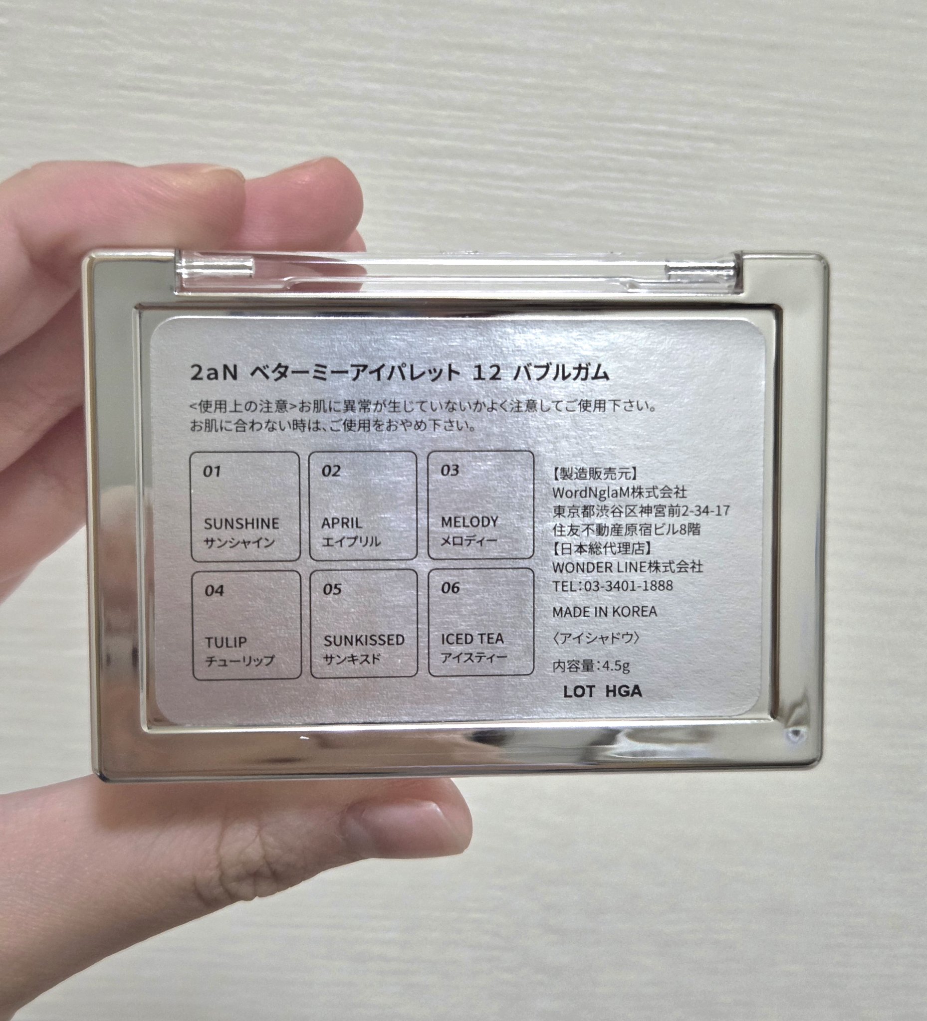 - <04 ニューデイ> タルク、マイカ、ジメチコン、合成フルオロフロゴパイト、酸化鉄、酸化チタン、ホウケイ酸(Ca/チタン)、ナイロン-12、オクテニルコハク酸デンプンAl、シリカ、メタクリル酸メチルクロスポリマー、窒化ホウ素、ステアロイルオキシステアリン酸オクチルドデシル、フェニルトリメチコン、ミリスチン酸Mg、ジエチルヘキサン酸ネオペンチルグリコール、メチルプロパンジオール、ラウリン酸ヘキシル、ヘキサ(ヒドロキシステアリン酸/ステアリン酸/ロジン酸)ジペンタエリスリチル、グンジョウ、(ジメチコン/ビニルジメチコン)クロスポリマー、ホウケイ酸(Ca/Al)、プロパンジオール、ステアリン酸Mg、(セバシン酸/イソパルミチン酸)ジグリセリル、トリエトキシカプリリルシラン、トリ(カプリル酸/カプリン酸)グリセリル、トリエチルヘキサノイン、セスキイソステアリン酸ソルビタン、マカデミア種子油、リンゴ酸ジイソステアリル、マンガンバイオレット、フェノキシエタノール、ステアリン酸ジメチコノール、合成ワックス、ラウロイルリシン、水酸化Al、メチコン、酸化スズ、サラソウジュ種子脂、水添レシチン、カルミン、カオリン、黄4、赤226、マルトデキストリン、トコフェロール <07 ラヴァブル> タルク、ジメチコン、マイカ、合成フルオロフロゴパイト、酸化チタン、シリカ、ホウケイ酸(Ca/チタン)、メタクリル酸メチルクロスポリマー、酸化鉄、マンガンバイオレット、ステアロイルオキシステアリン酸オクチルドデシル、オクテニルコハク酸デンプンAl、ホウケイ酸(Ca/Na)、ミリスチン酸Mg、メチルプロパンジオール、ジエチルヘキサン酸ネオペンチルグリコール、トリ(カプリル酸/カプリン酸)グリセリル、ホウケイ酸(Ca/Al)、フェニルトリメチコン、ラウリン酸ヘキシル、(ジメチコン/ビニルジメチコン)クロスポリマー、硫酸Ba、ヘキサ(ヒドロキシステアリン酸/ステアリン酸/ロジン酸)ジペンタエリスリチル、プロパンジオール、ナイロン-12、(セバシン酸/イソパルミチン酸)ジグリセリル、グンジョウ、マカデミア種子油、ステアリン酸Mg、セスキイソステアリン酸ソルビタン、トリエトキシカプリリルシラン、リンゴ酸ジイソステアリル、カルミン、合成ワックス、水添レシチン、カオリン、ラウロイルリシン、水酸化Al、酸化スズ、赤226、メチコン、マルトデキストリン、トコフェロール <08 ピンクブーム> タルク、マイカ、ジメチコン、合成フルオロフロゴパイト、酸化チタン、酸化鉄、シリカ、メタクリル酸メチルクロスポリマー、ナイロン-12、窒化ホウ素、マンガンバイオレット、ホウケイ酸(Ca/Al)、トリ(カプリル酸/カプリン酸)グリセリル、ミリスチン酸Mg、フェニルトリメチコン、ステアロイルオキシステアリン酸オクチルドデシル、メチルプロパンジオール、ジエチルヘキサン酸ネオペンチルグリコール、ホウケイ酸(Ca/チタン)、グンジョウ、ラウリン酸ヘキシル、ホウケイ酸(Ca/Na)、ヘキサ(ヒドロキシステアリン酸/ステアリン酸/ロジン酸)ジペンタエリスリチル、(ジメチコン/ビニルジメチコン)クロスポリマー、プロパンジオール、(セバシン酸/イソパルミチン酸)ジグリセリル、ステアリン酸Mg、セスキイソステアリン酸ソルビタン、リンゴ酸ジイソステアリル、カルミン、マカデミア種子油、オクチルドデカノール、トリエトキシカプリリルシラン、水添レシチン、合成ワックス、ステアリン酸ジメチコノール、カオリン、赤226、酸化スズ、ラウロイルリシン、水酸化Al、メチコン、マルトデキストリン、黄4、トコフェロール <09 ドリームキャッチャー> タルク、マイカ、ジメチコン、合成フルオロフロゴパイト、酸化チタン、ホウケイ酸(Ca/Al)、オクテニルコハク酸デンプンAl、酸化鉄、メタクリル酸メチルクロスポリマー、シリカ、窒化ホウ素、ステアロイルオキシステアリン酸オクチルドデシル、フェニルトリメチコン、ホウケイ酸(Ca/チタン)、マンガンバイオレット、ミリスチン酸Mg、グンジョウ、メチルプロパンジオール、ジエチルヘキサン酸ネオペンチルグリコール、ラウリン酸ヘキシル、オクチルドデカノール、ヘキサ(ヒドロキシステアリン酸/ステアリン酸/ロジン酸)ジペンタエリスリチル、(ジメチコン/ビニルジメチコン)クロスポリマー、ナイロン-12、プロパンジオール、(セバシン酸/イソパルミチン酸)ジグリセリル、リンゴ酸ジイソステアリル、セスキイソステアリン酸ソルビタン、銀、ステアリン酸Mg、トリエトキシカプリリルシラン、炭酸Ca、ステアリン酸ジメチコノール、マカデミア種子油、合成ワックス、トリ(カプリル酸/カプリン酸)グリセリル、メチコン、カルミン、カオリン、酸化スズ、水添レシチン、水酸化Al、赤226、ラウロイルリシン、マルトデキストリン、トコフェロール <10 ピクニック> タルク、ジメチコン、マイカ、合成フルオロフロゴパイト、酸化チタン、シリカ、酸化鉄、メタクリル酸メチルクロスポリマー、トリ(カプリル酸/カプリン酸)グリセリル、オ