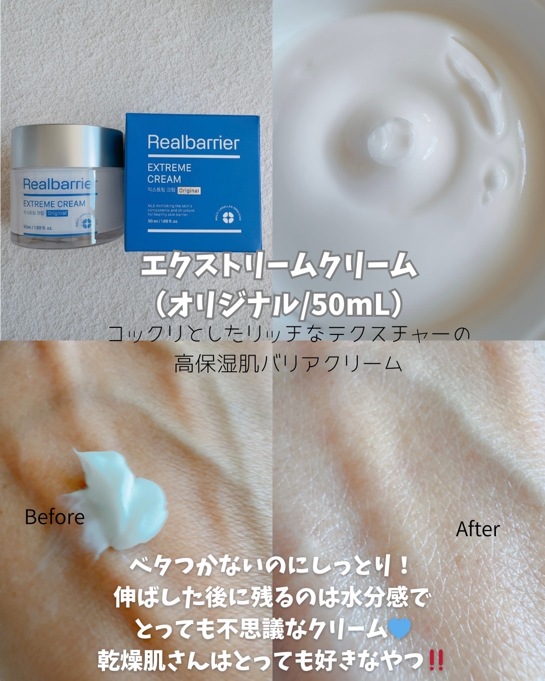 リアルバリア様の商品を紹介します‼︎★エクストリームクリーム (オリジナル50mL) コックリとしたリッチなテクスチャーで高保湿に肌バリアクリームしてくれる肌に溶け込むように馴染んでベタつきもないよ ★エクストリームクリーム (ライト50mL...