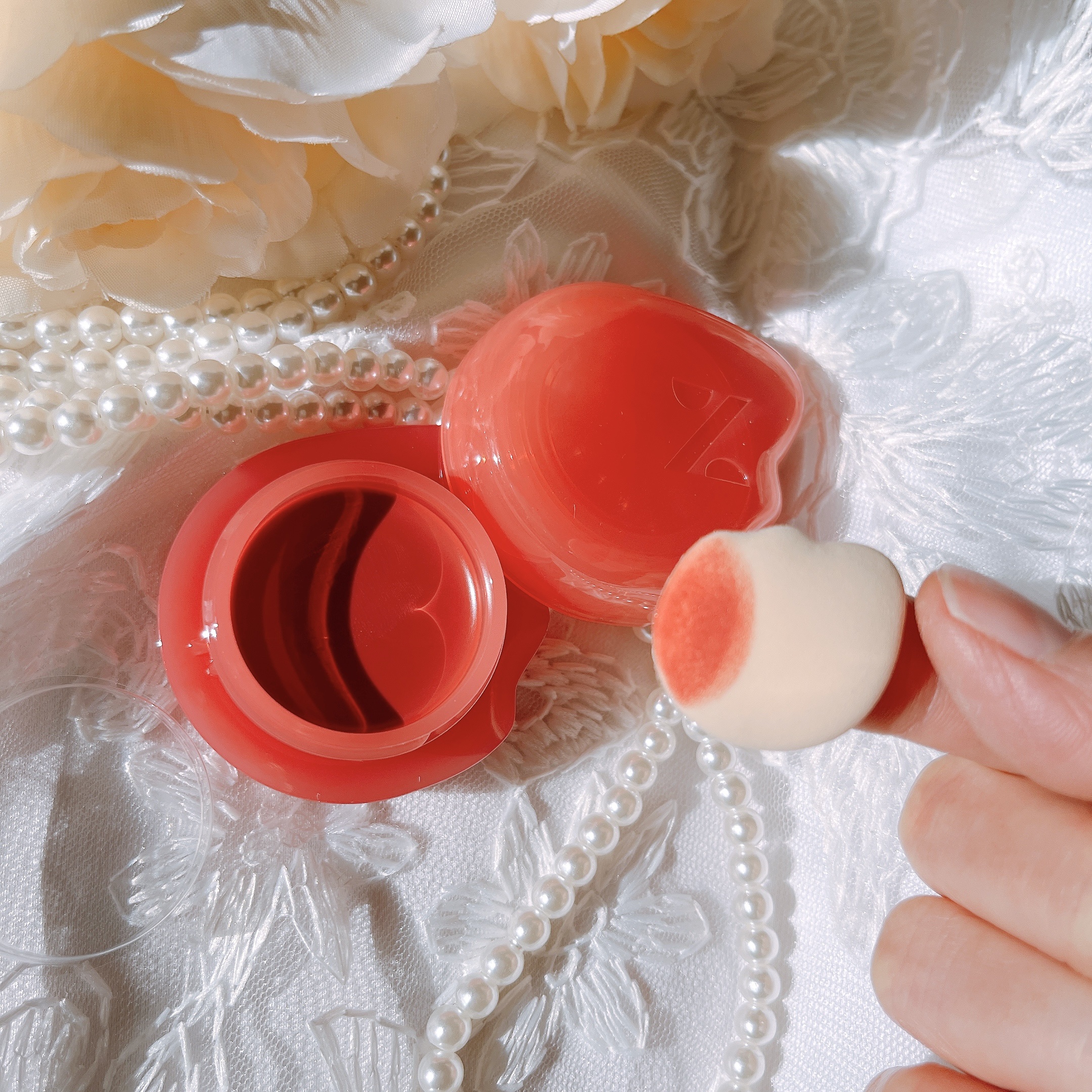 - チークにもリップにも使えるゼリーバーム。ポンポンとなじませるだけで、自然な血色感とツヤをプラス。 手を汚さず使える「専用指パフ」付きで、ケース内にすっきり収納可能。 パフをなくす心配もなく、外出先でもサッと使えて便利です。