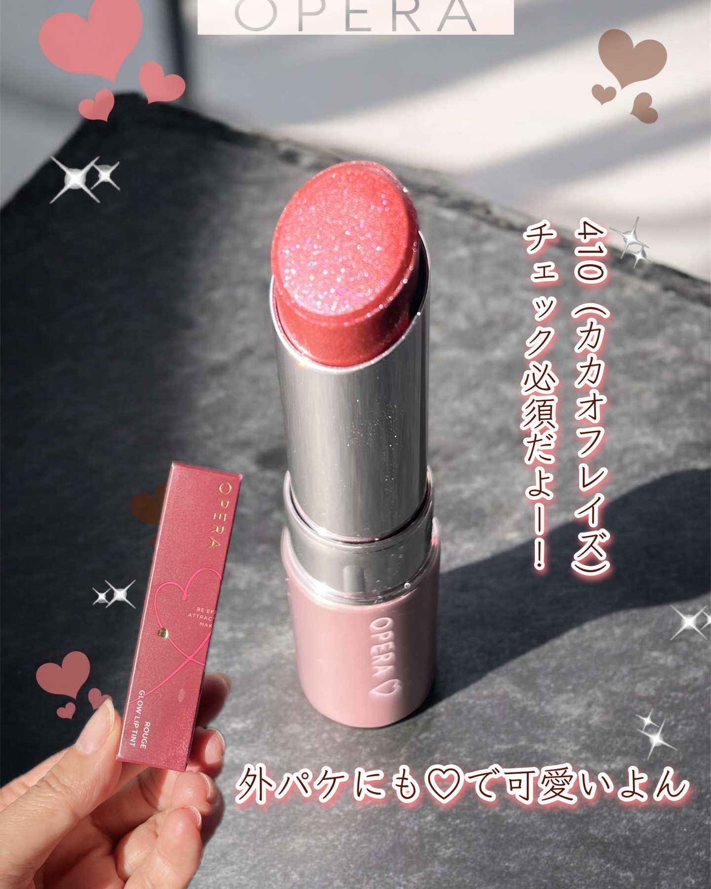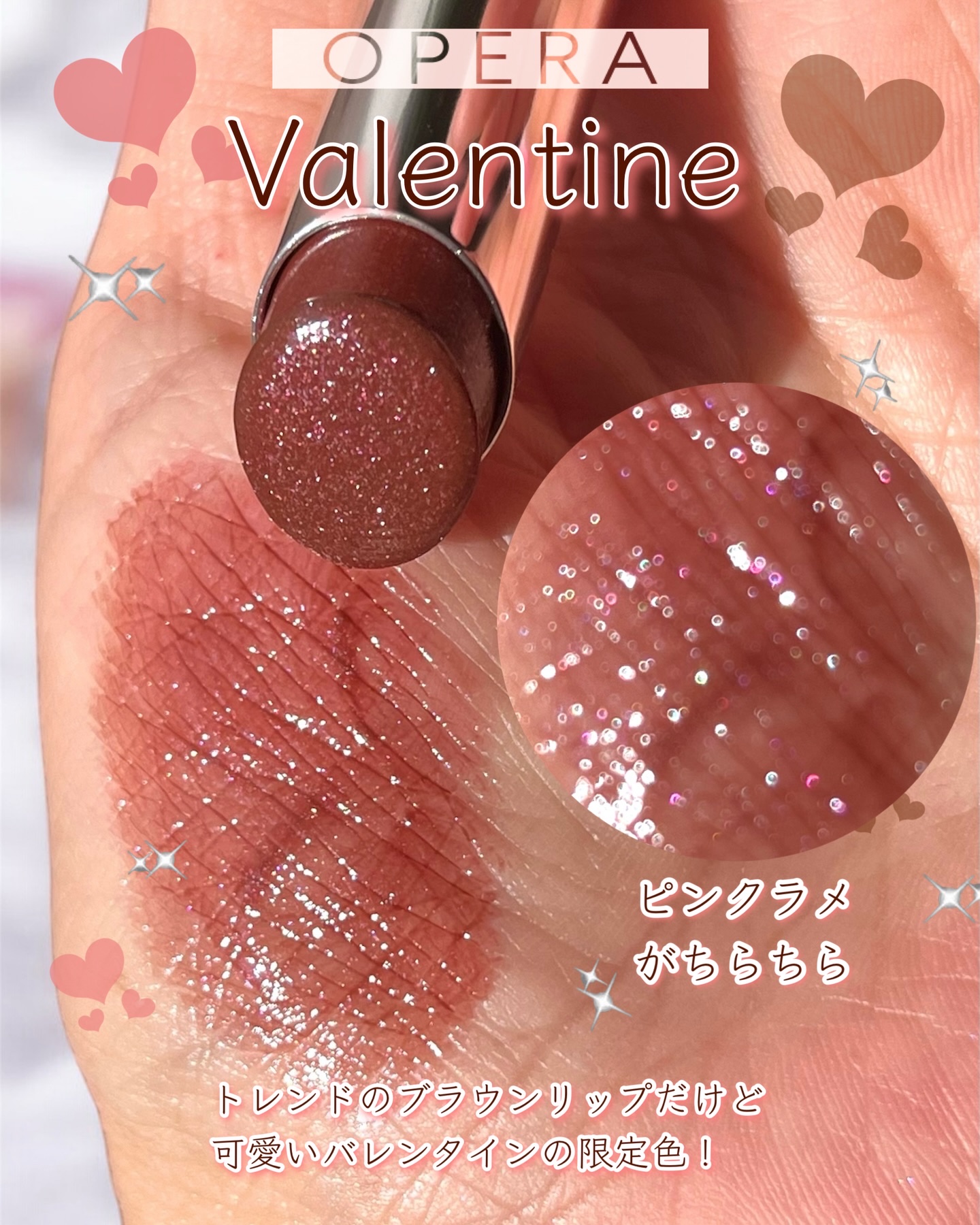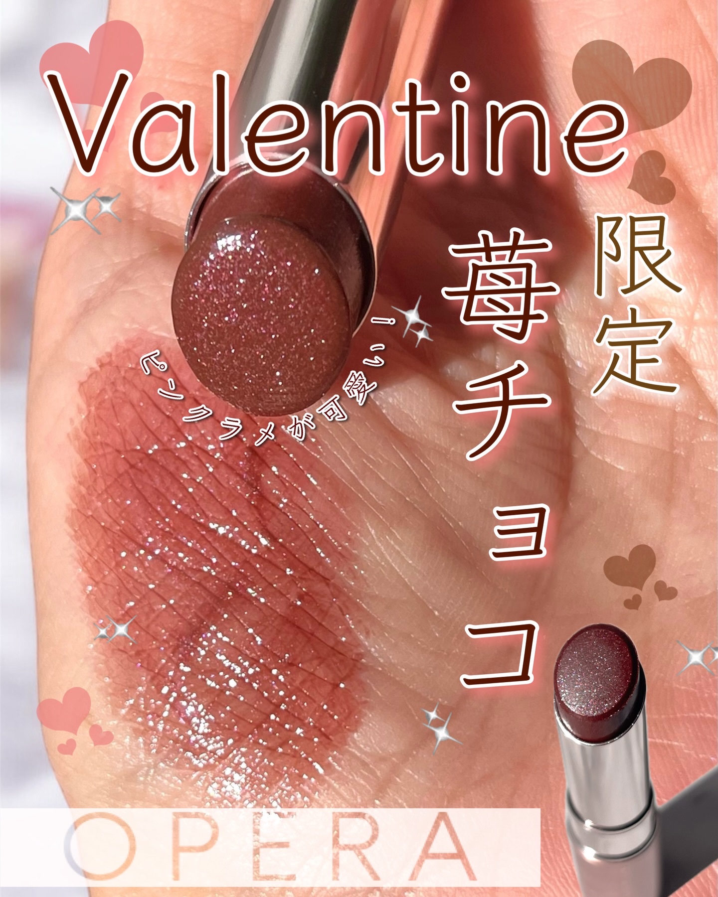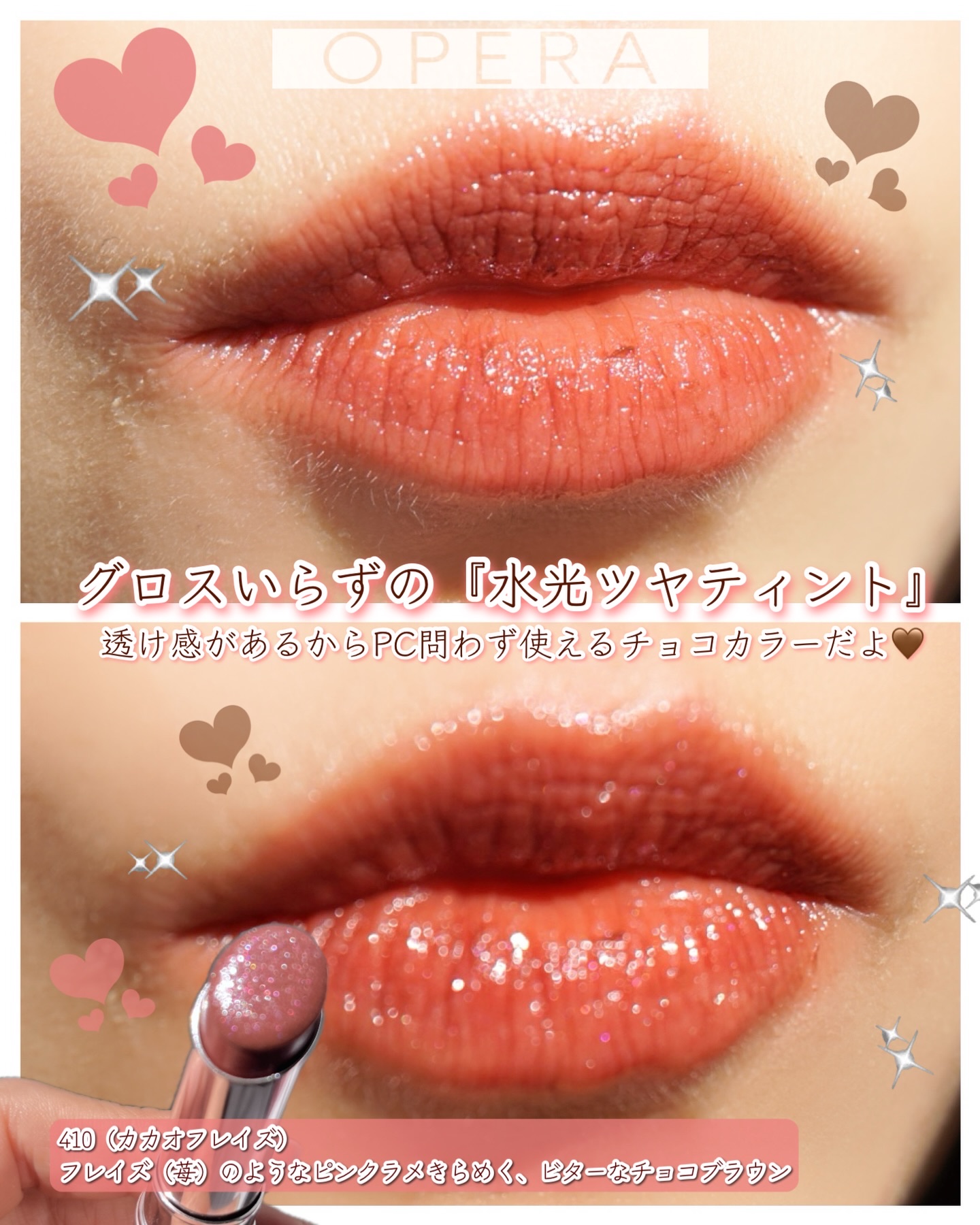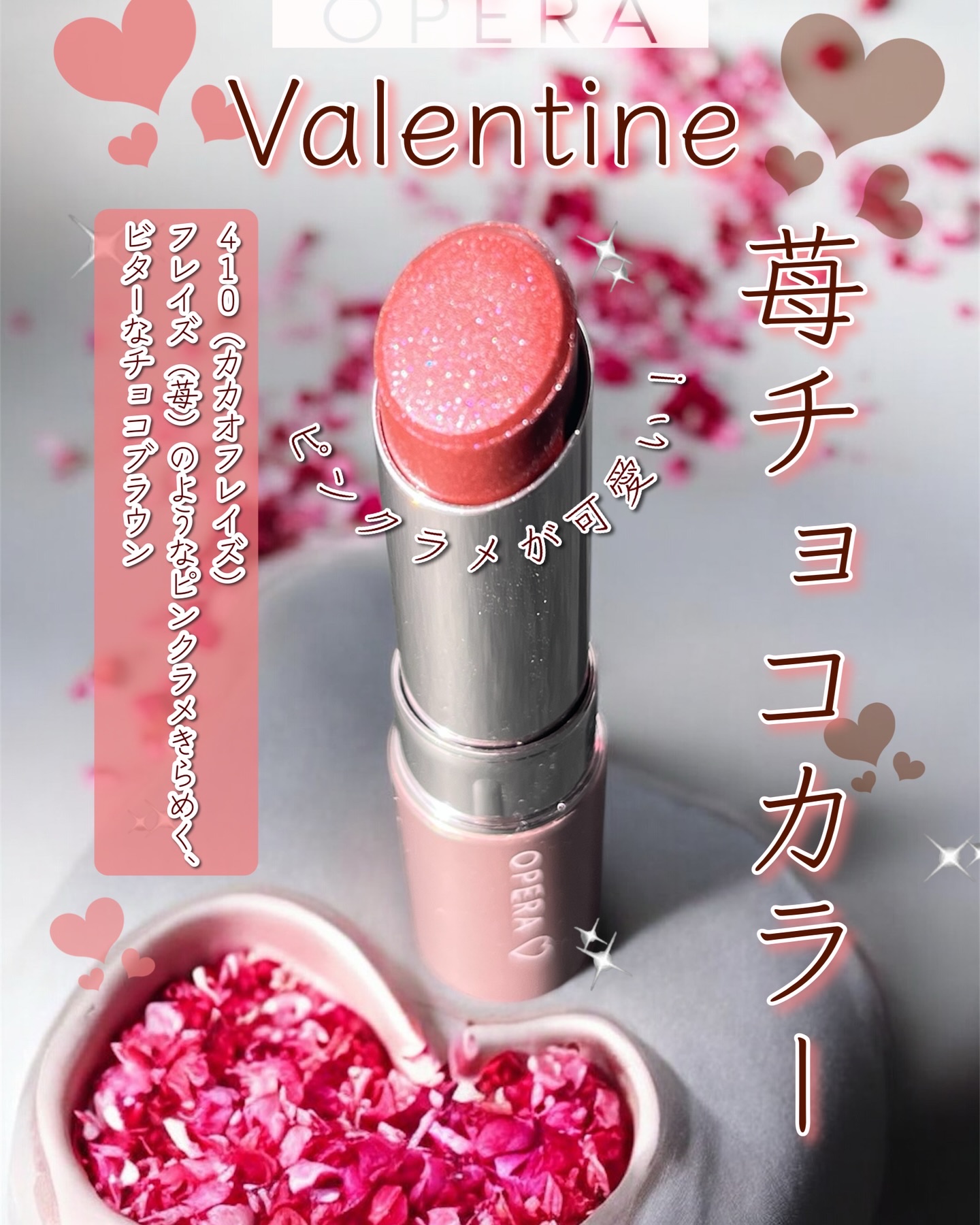 .オペラのティントのバレンタイン限定色410カカオフレイズはピンクラメが入ったチョコレートブラウン🍫🍓フリーズドライのいちごが散りばめられたチョコみたいでかわいすぎませんか…!オペラのリップってかわいらしい感じの色が多いイメージだったけどこれ...