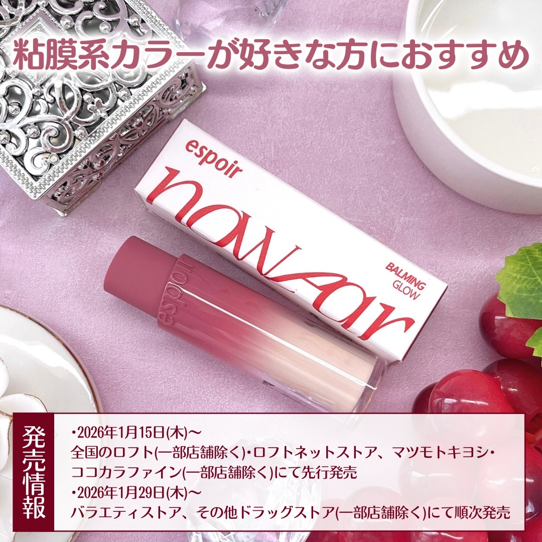 塗って時間が経つと唇の凹凸をなめらかにして密着し、ぷるんとしたボリューム感のある唇に♡♡ サラッとしたなめらかなテクスチャーで軽いつけ心地でベタつきもないため、塗っても不快感がなく使いやすいです😊 今回の新色は穏やかな春風のようにより一層柔らかくなった果実をイメージしたレイジーベージュカラー!!