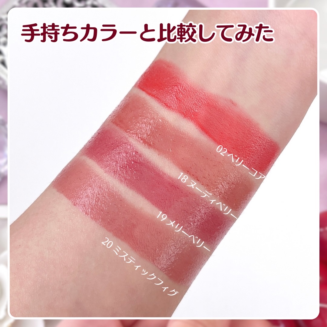- <12 ピュアモモ【日本限定カラー】> ペンタイソステアリン酸ジペンタエリスリチル、トリ(カプリル酸/カプリン酸)グリセリル、ラウロイルグルタミン酸ジ(フィトステリル/オクチルドデシル)、オクチルドデカノール、グリセリルウンデシルジメチコン、ジフェニルジメチコン、合成ワックス、ダイマージリノール酸(フィトステリル/イソステアリル/セチル/ステアリル/ベヘニル)、トリイソステアリン酸ポリグリセリル-2、ラウリルポリグリセリル-3ポリジメチルシロキシエチルジメチコン、(アクリレーツ/アクリル酸ステアリル/メタクリル酸ジメチコン)コポリマー、ポリヒドロキシステアリン酸、(エチレン/プロピレン)コポリマー、ジメチコン、レシチン、香料、パルミチン酸エチルヘキシル、イソステアリン酸、ミリスチン酸イソプロピル、ポリリシノレイン酸ポリグリセリル-3、トリエトキシカプリリルシラン、水酸化Al、トコフェロール、酸化チタン、酸化鉄、赤202、黄4、赤201 <01 ヴィヴィディ【EC展開カラー】> ペンタイソステアリン酸ジペンタエリスリチル、トリ(カプリル酸/カプリン酸)グリセリル、ラウロイルグルタミン酸ジ(フィトステリル/オクチルドデシル)、オクチルドデカノール、グリセリルウンデシルジメチコン、ジフェニルジメチコン、合成ワックス、ダイマージリノール酸(フィトステリル/イソステアリル/セチル/ステアリル/ベヘニル)、トリイソステアリン酸ポリグリセリル-2、(アクリレーツ/アクリル酸ステアリル/メタクリル酸ジメチコン)コポリマー、ラウリルポリグリセリル-3ポリジメチルシロキシエチルジメチコン、(エチレン/プロピレン)コポリマー、ジメチコン、ポリヒドロキシステアリン酸、香料、レシチン、パルミチン酸エチルヘキシル、イソステアリン酸、ミリスチン酸イソプロピル、ポリリシノレイン酸ポリグリセリル-3、水酸化Al、トリエトキシカプリリルシラン、トコフェロール、赤226、黄5、赤104(1)、酸化チタン、赤201 <02 ベリーコア> ペンタイソステアリン酸ジペンタエリスリチル、トリ(カプリル酸/カプリン酸)グリセリル、オクチルドデカノール、ラウロイルグルタミン酸ジ(フィトステリル/オクチルドデシル)、グリセリルウンデシルジメチコン、ジフェニルジメチコン、合成ワックス、ダイマージリノール酸(フィトステリル/イソステアリル/セチル/ステアリル/ベヘニル)、トリイソステアリン酸ポリグリセリル-2、(アクリレーツ/アクリル酸ステアリル/メタクリル酸ジメチコン)コポリマー、ラウリルポリグリセリル-3ポリジメチルシロキシエチルジメチコン、(エチレン/プロピレン)コポリマー、ジメチコン、香料、トコフェロール、赤202、赤201、黄5、酸化鉄 <03 クランベリー【EC展開カラー】> ペンタイソステアリン酸ジペンタエリスリチル、オクチルドデカノール、トリ(カプリル酸/カプリン酸)グリセリル、ラウロイルグルタミン酸ジ(フィトステリル/オクチルドデシル)、グリセリルウンデシルジメチコン、ジフェニルジメチコン、合成ワックス、ダイマージリノール酸(フィトステリル/イソステアリル/セチル/ステアリル/ベヘニル)、トリイソステアリン酸ポリグリセリル-2、(アクリレーツ/アクリル酸ステアリル/メタクリル酸ジメチコン)コポリマー、ラウリルポリグリセリル-3ポリジメチルシロキシエチルジメチコン、(エチレン/プロピレン)コポリマー、ジメチコン、香料、リンゴ酸ジイソステアリル、トコフェロール、ポリヒドロキシステアリン酸、レシチン、トリエトキシカプリリルシラン、パルミチン酸エチルヘキシル、イソステアリン酸、ミリスチン酸イソプロピル、ポリリシノレイン酸ポリグリセリル-3、酸化鉄、黄5、赤202、赤230(1) <04 ヘイベスティ【EC展開カラー】> ペンタイソステアリン酸ジペンタエリスリチル、トリ(カプリル酸/カプリン酸)グリセリル、ラウロイルグルタミン酸ジ(フィトステリル/オクチルドデシル)、オクチルドデカノール、ジフェニルジメチコン、グリセリルウンデシルジメチコン、合成ワックス、ダイマージリノール酸(フィトステリル/イソステアリル/セチル/ステアリル/ベヘニル)、トリイソステアリン酸ポリグリセリル-2、ラウリルポリグリセリル-3ポリジメチルシロキシエチルジメチコン、(アクリレーツ/アクリル酸ステアリル/メタクリル酸ジメチコン)コポリマー、ポリヒドロキシステアリン酸、(エチレン/プロピレン)コポリマー、ジメチコン、レシチン、香料、パルミチン酸エチルヘキシル、イソステアリン酸、ミリスチン酸イソプロピル、ポリリシノレイン酸ポリグリセリル-3、水酸化Al、トリエトキシカプリリルシラン、トコフェロール、酸化チタン、赤202、黄5、赤104(1)、酸化鉄、青1 <05 ブルーベリー> ペンタイソステアリン酸ジペンタエリスリチル、トリ(カプリル酸/カプリン酸)グリセリル、ラウロイルグルタミン酸ジ(フィトステリル/オクチルドデシル)、オクチルドデカノール、グリセリルウンデシルジメチコン、ジフェニルジメチコン、合