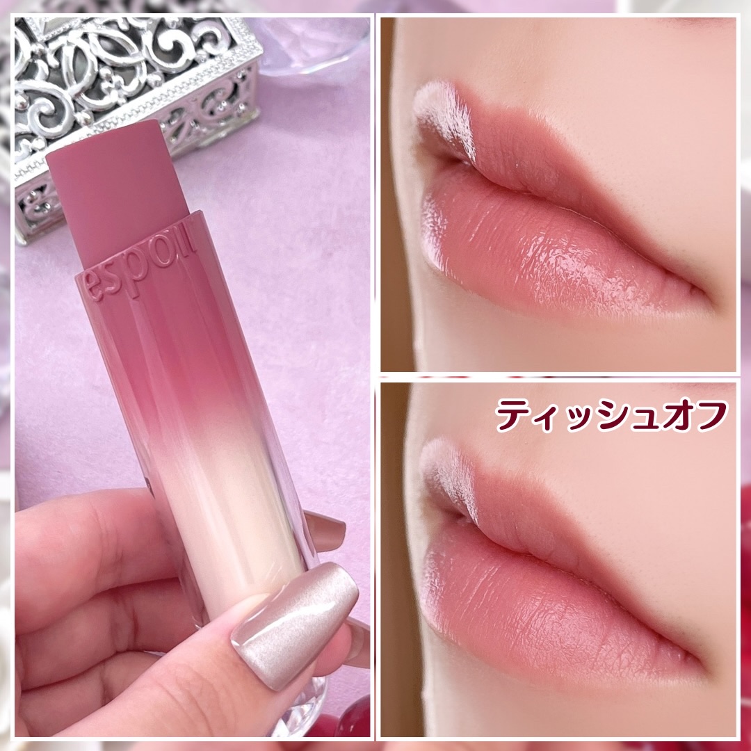 このリップは塗布後しばらくするとゲル層とシリコーン層の2層膜を形成!! ゲル層が唇にピタッと密着することで高いラスティング効果を実現し擦れに強く長時間色持ちをキープ!! そして塗布膜表面のシリコーン層が高い透明感と程よいツヤ感を演出してくれるんです😊 スルスルっと軽くなめらかな塗り心地で、唇にピタッと色が密着してくれている感じがすごいする✨ 1度塗りでも十分なくらい発色がとてもよく、ムラなく均一に綺麗に塗れるのがとても良き🙆♀️ 塗ってから60秒何もせずに待つと色持ちがUP!! 軽くティッシュオフしても色味が全然落ちないのが感動😭ツヤ感は落ちてしまうけど… 5種のオーガニック植物抽出成分を配合したり、アルコール等を使用してないので唇にも優しいので唇が荒れやすい方にもオススメです☺️