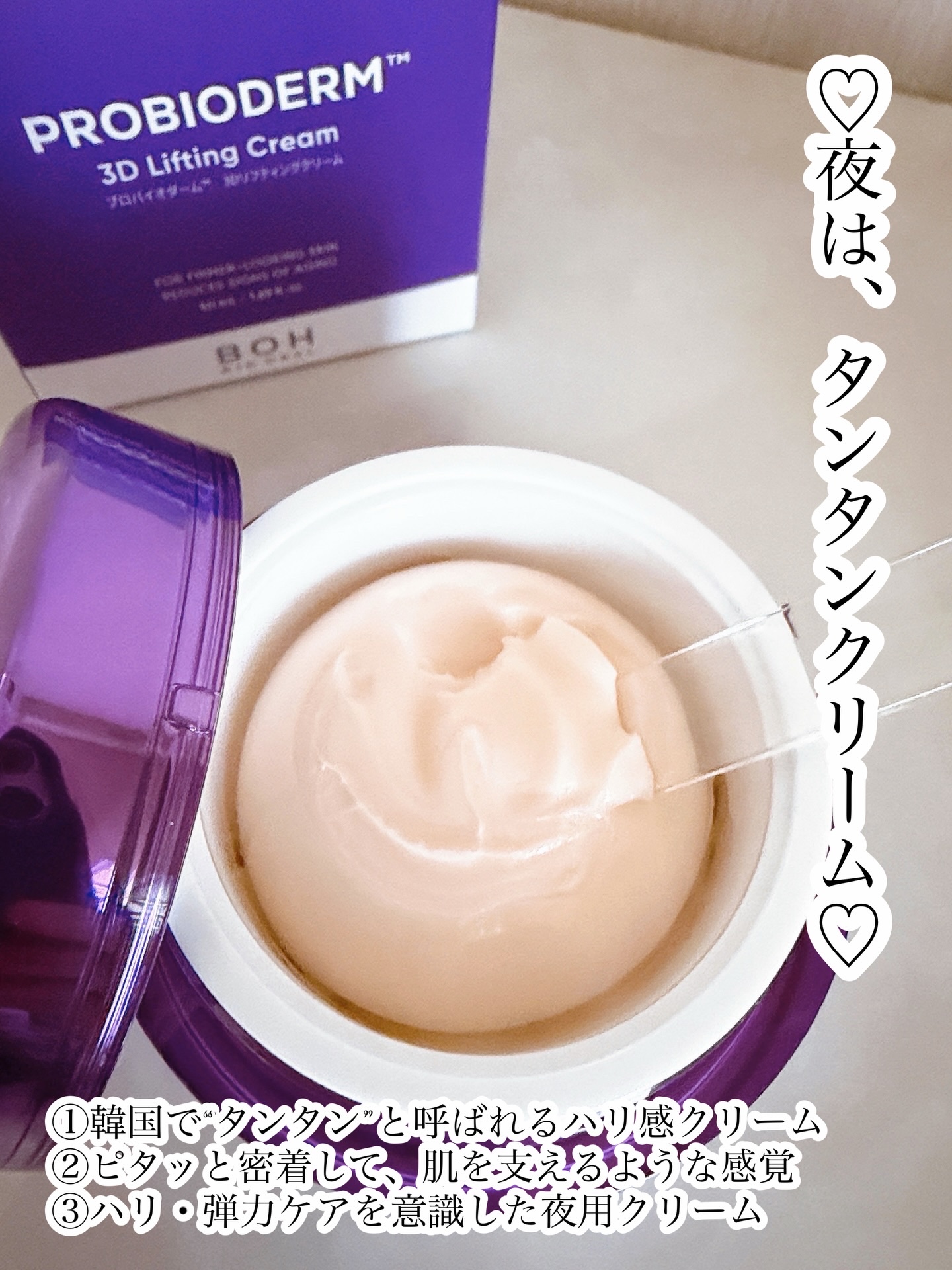 \どっちも使っちゃう?✊🏻/ちゅるちゅる?たんたん?あなたはどっち派?🫧💜韓国発スキンケアブランドBOHのプロバイオダーム™クリームを、朝夜で使い分けしてますっっ✌🏻🌙夜は【3Dリフティングクリーム】こっくり濃厚なテクスチャーで寝ている間にハ...