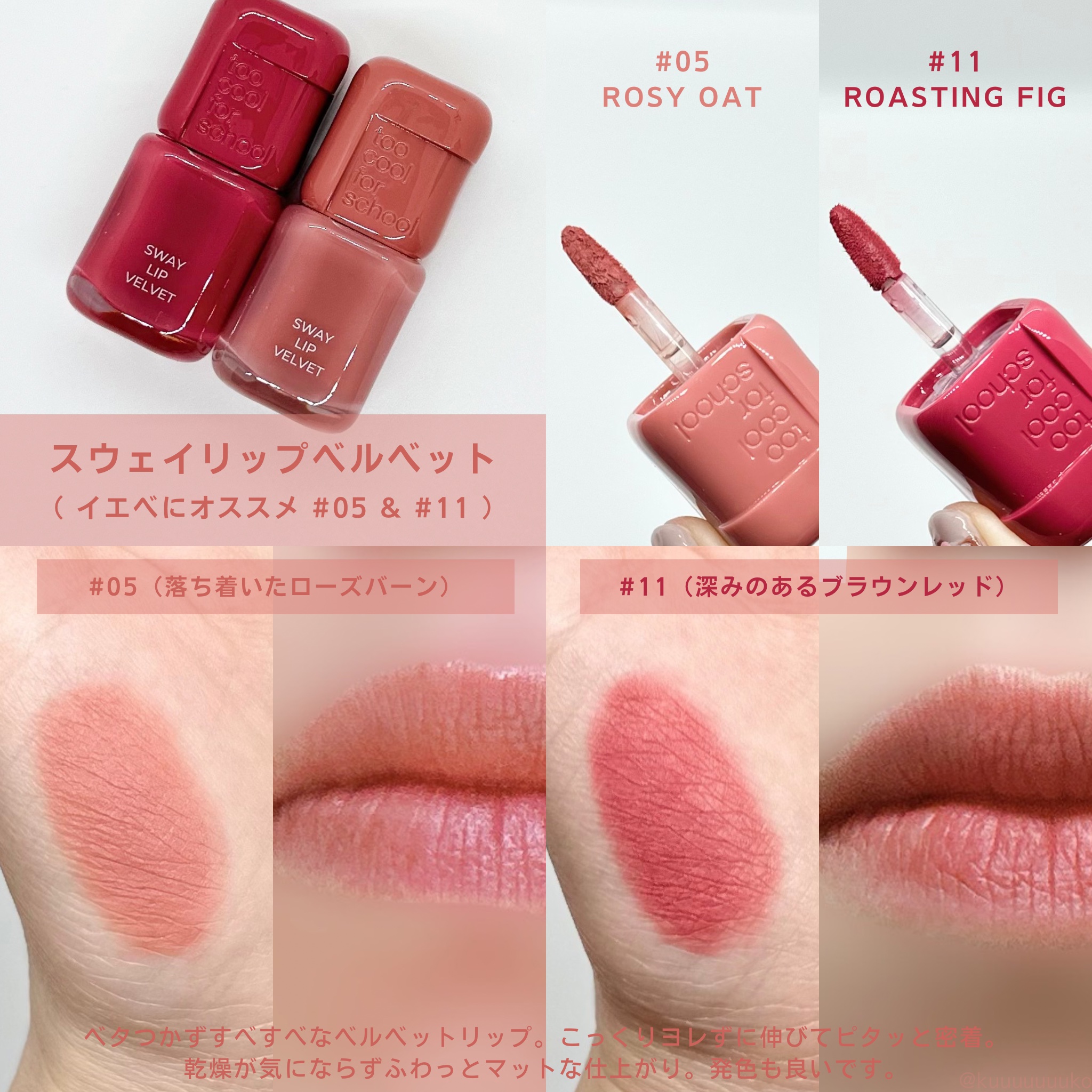 べたつかずふんわりとしたマット質感で、冬のメイクにぴったりのベルベットリップtoocoolforschoolSwayLipVelvetがかわいいすぎた💗❄️マットリップって乾燥が気になるイメージだったんだけど、これはベルベットのようなすべすべ...
