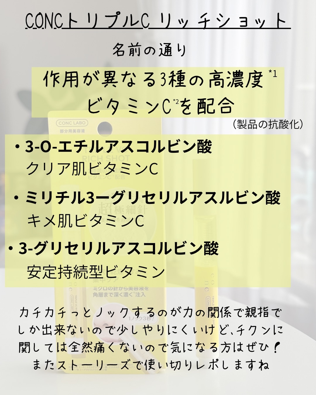 - 機能が異なる3種の高濃度※3ビタミンC※4を配合し、多様な肌効果を1本に凝縮しました。部分悩み(毛穴、くすみ※7)などしっかりアプローチしたい部分にノックするだけで、マイクロニードルで直接角層内に注入※2できます。 〈3種の高濃度※3ビタミンC※4配合〉 ○クリア肌ビタミンC※4(3-O-エチルアスコルビン酸) ○キメ肌ビタミンC※4(ミリチル3-グリセリルアスコルビン酸) ○安定持続型ビタミン※4C(3-グリセリルアスコルビン酸) 整肌成分:ユーグレナエキス配合 ※2 角層まで ※3 CONC LABO内で ※4 製品の抗酸化 ※7 乾燥により目立つ毛穴およびくすみ印象のこと 一部店舗では2025年3月1日(土)より先行発売。インターネットモールの楽天市場、Yahoo!ショッピングでは2025年3月17日(月)より発売。)