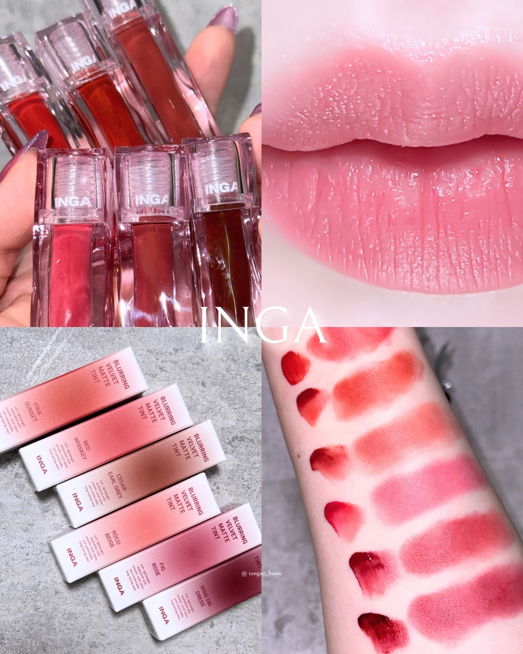 INGAブラーリングベルベットマットティント✨1/9新発売した垢抜けマットリップ💄ふんわりマシュマロみたいなピュアな印象なのに、滑らかなつけ心地の超軽量マットティントリップ🌟大きめのチップタイプに保湿&鎮静ケア成分配合なので、しっとりとしたつ...