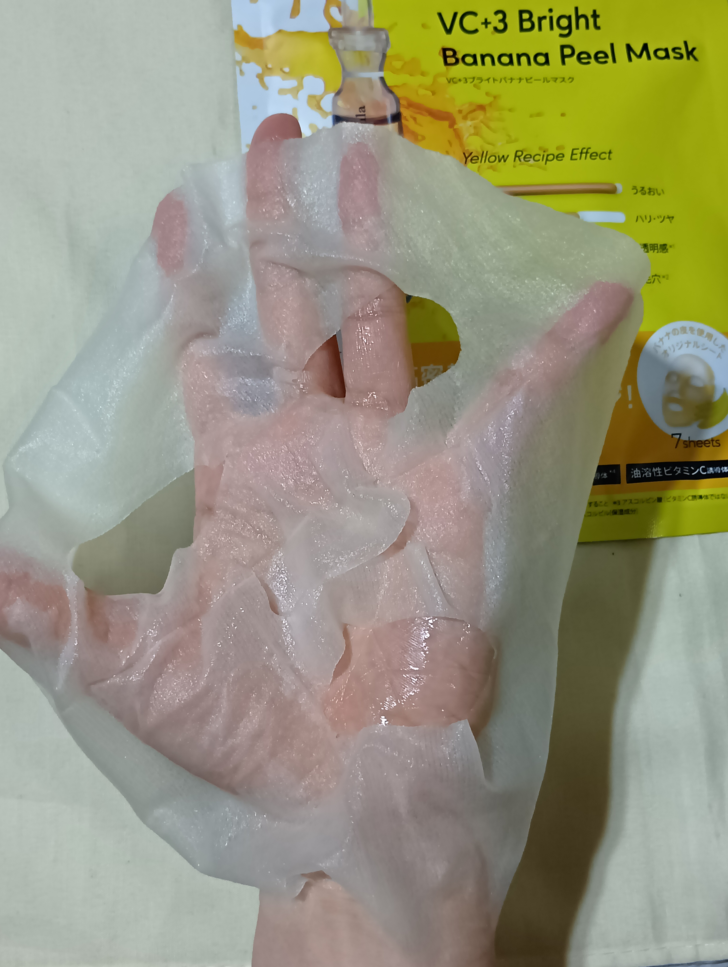 𓈒𓏸✾𓏸𓈒VC+3ブライトニングバナナピールマスクバナナの皮から抽出した繊維をそのままシートに使用してありますミネラルを豊富に含むバナナならではの力で、乱れがちな肌環境を整えてくれるそうですシート自体はほんのり黄色のバナナ色ですが、バナ...