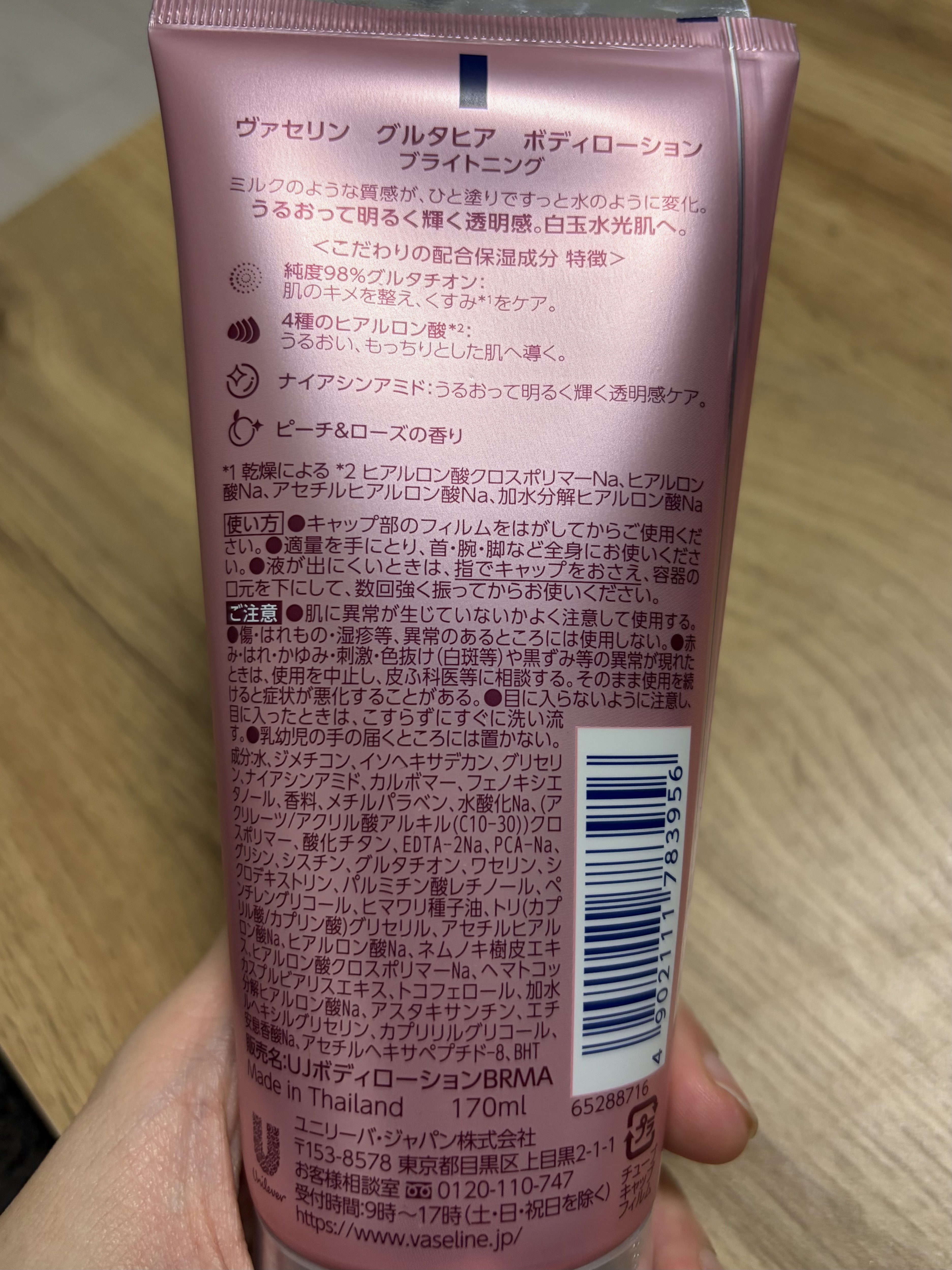 ヴァセリンGLUTA-HYA(グルタヒア)ボディローション ブライトニング海外の方ではすでに発売されてたみたいですね。日本では2月に発売予定。グルタチオン、ヒアルロン酸、ナイアシンアミドなど、こだわりの保湿成分配合。うるおって明るく輝...