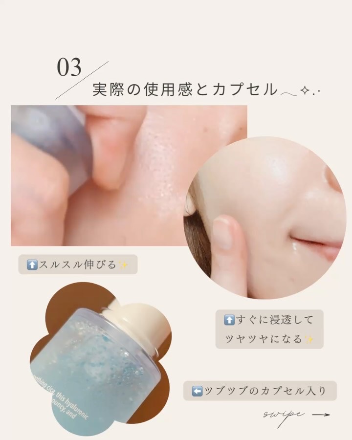 Meebakさまからいただきました❤️..3秒で使えるうるおいチャージ今の季節にもぴったりなCICA・HAセラムをお試ししました!弾けるヒアルロン酸カプセルが配合されており、角質層までじんわりうるおいを届けます。ジェルテクスチャーでみずみずし...
