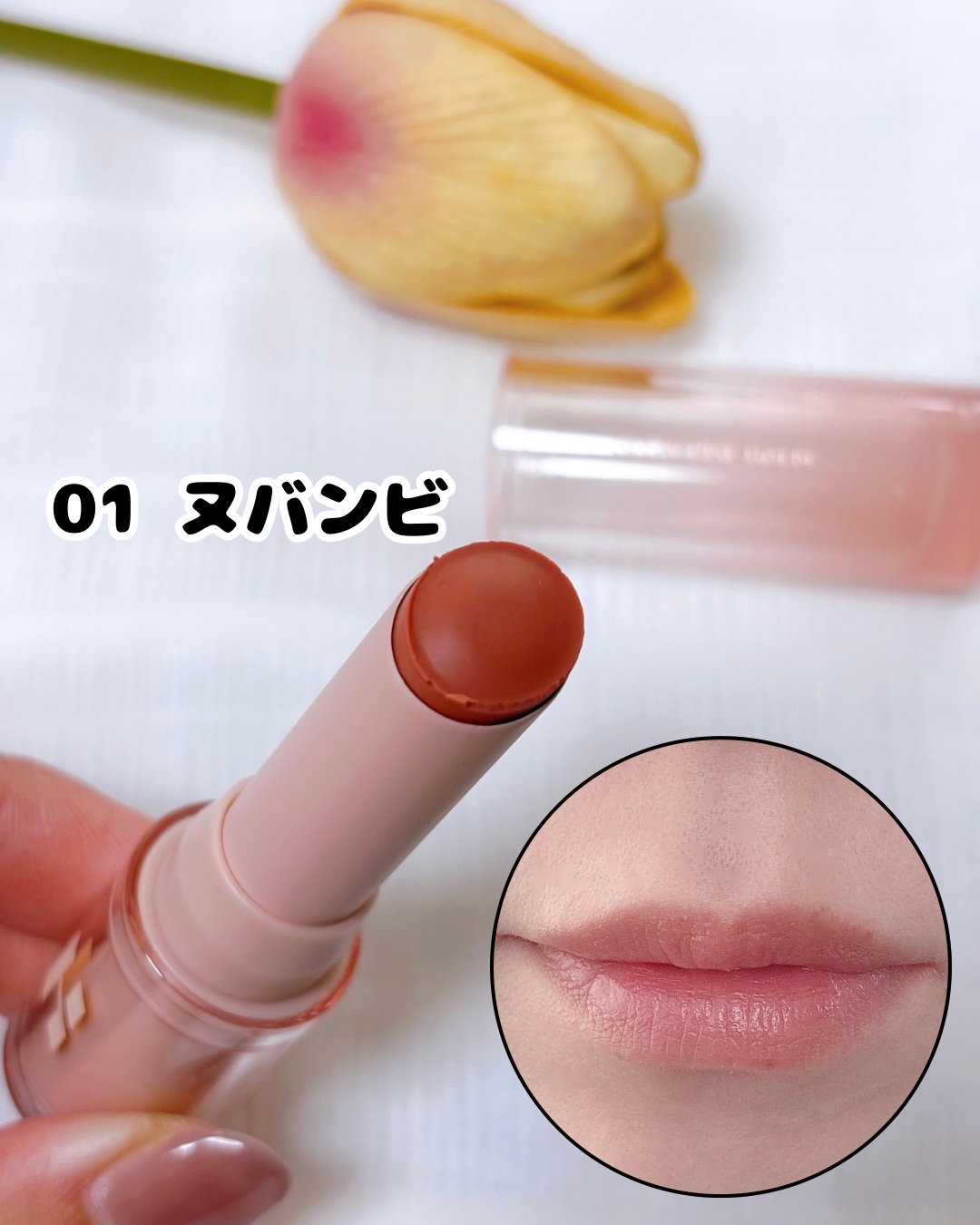 HOLIKAHOLIKA・ホリカホリカヌーディーリップ💄01ヌバンビは、同シリーズの中でも韓国で大きな注目を集めた人気カラー💗単品使いはもちろん、ベースカラーとしてもSNSで話題❕じゅわっと重ねるほどふっくら🫶上品なツヤ感がたまらない🥹ツヤは...