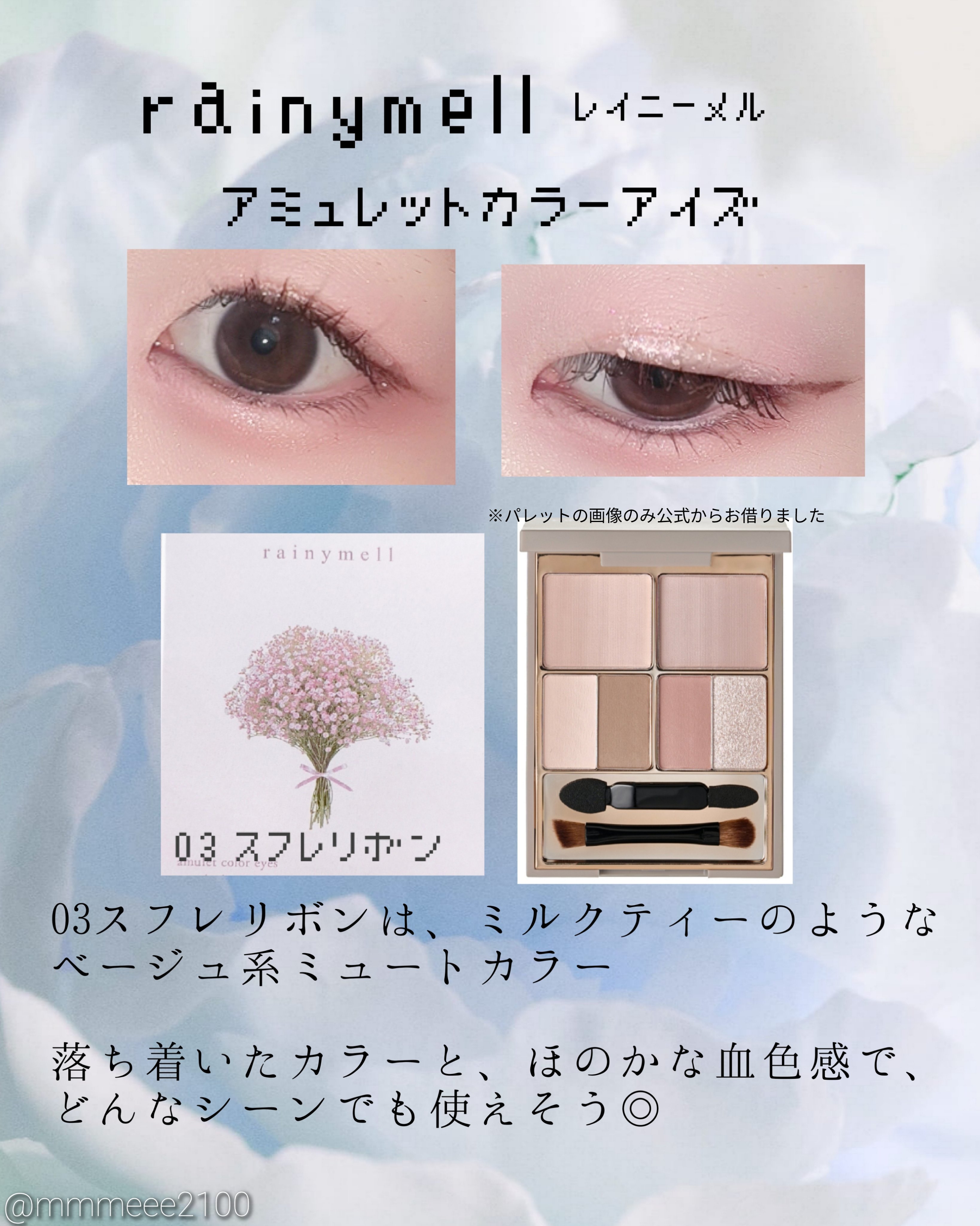 愛らしい6色をコンパクトにぎゅっと詰め込んだパレット。 このパレットで眉毛・アイシャドウ・チーク全部いけちゃう! 1000円台らしからぬこの高級感よ。 大きいミラーやチップもついて、パケもしっかりしていて安心感がすごい。 締め色のない全体的に淡いカラーが魅力。 特に私は上2色が気に入ってます。目元に使ってもほのかな陰影が出て盛れるし、チークに使っても可愛い。