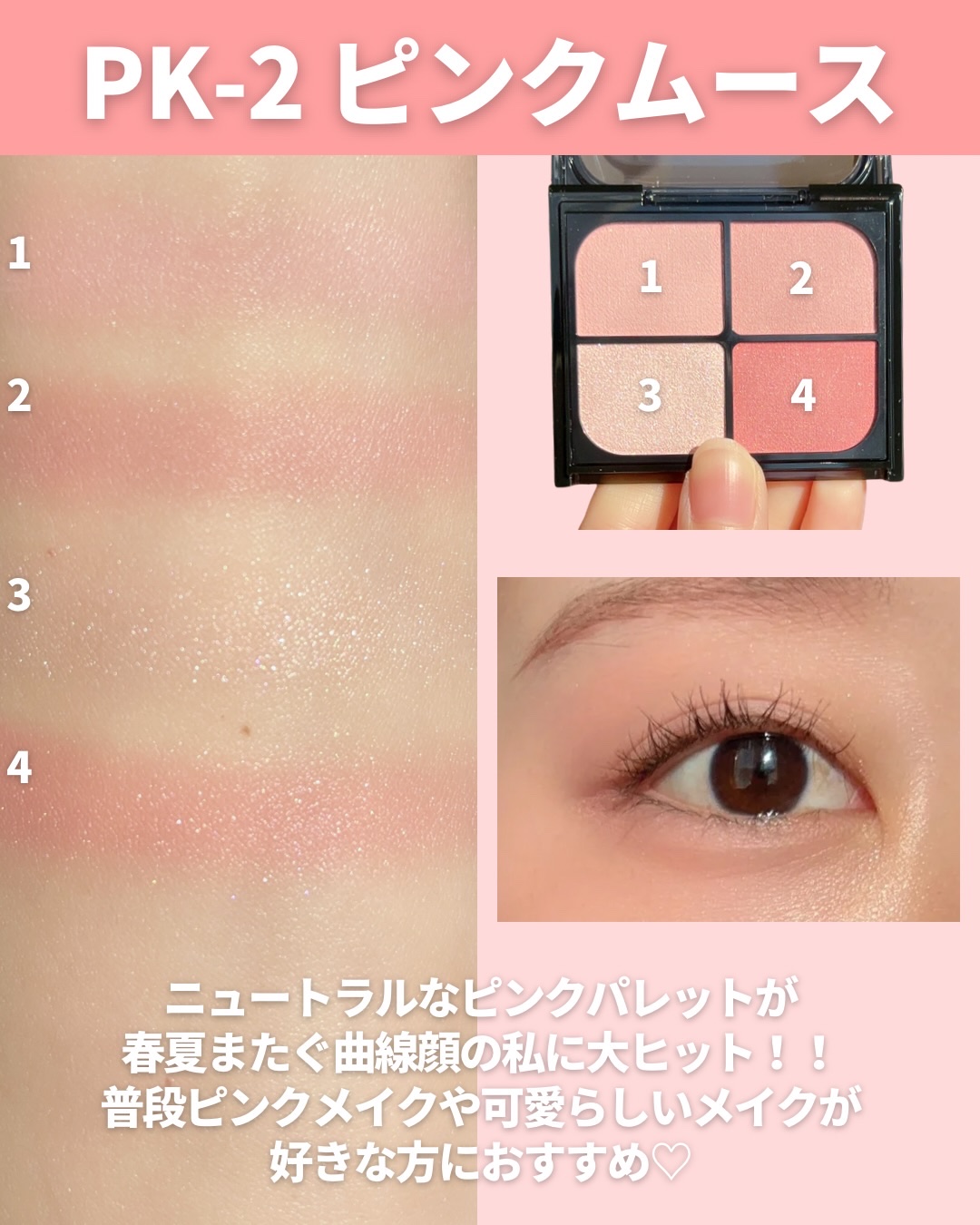 ルナソルのピンクはラメ感控えめなのでオフィスメイクにおすすめ🙆🏻♀️✨ CHANELはかなり万能だと思っていて、柔らかく仕上げればイエベ春の私ももちろんハマるし✨ ブランドごとにもちろん特徴がありますし、ピンクといってもパレットによって仕上がりはさまざま!