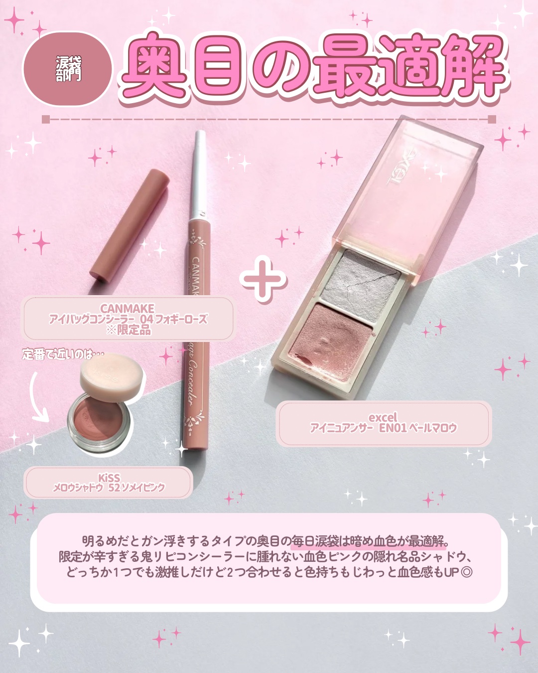過去イチの神作!"爆発級"涙袋💥 まさかのテーマは「NOTナチュラル」で、もっともっと盛りたい人へ向けた新作。 しっかり盛るのにギリ白浮きしない絶妙白みピンク大好き!