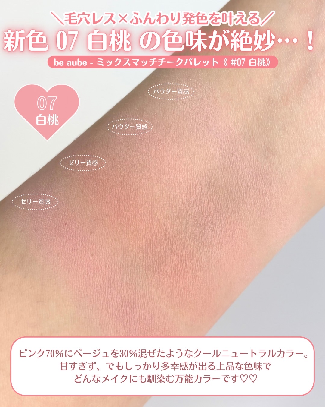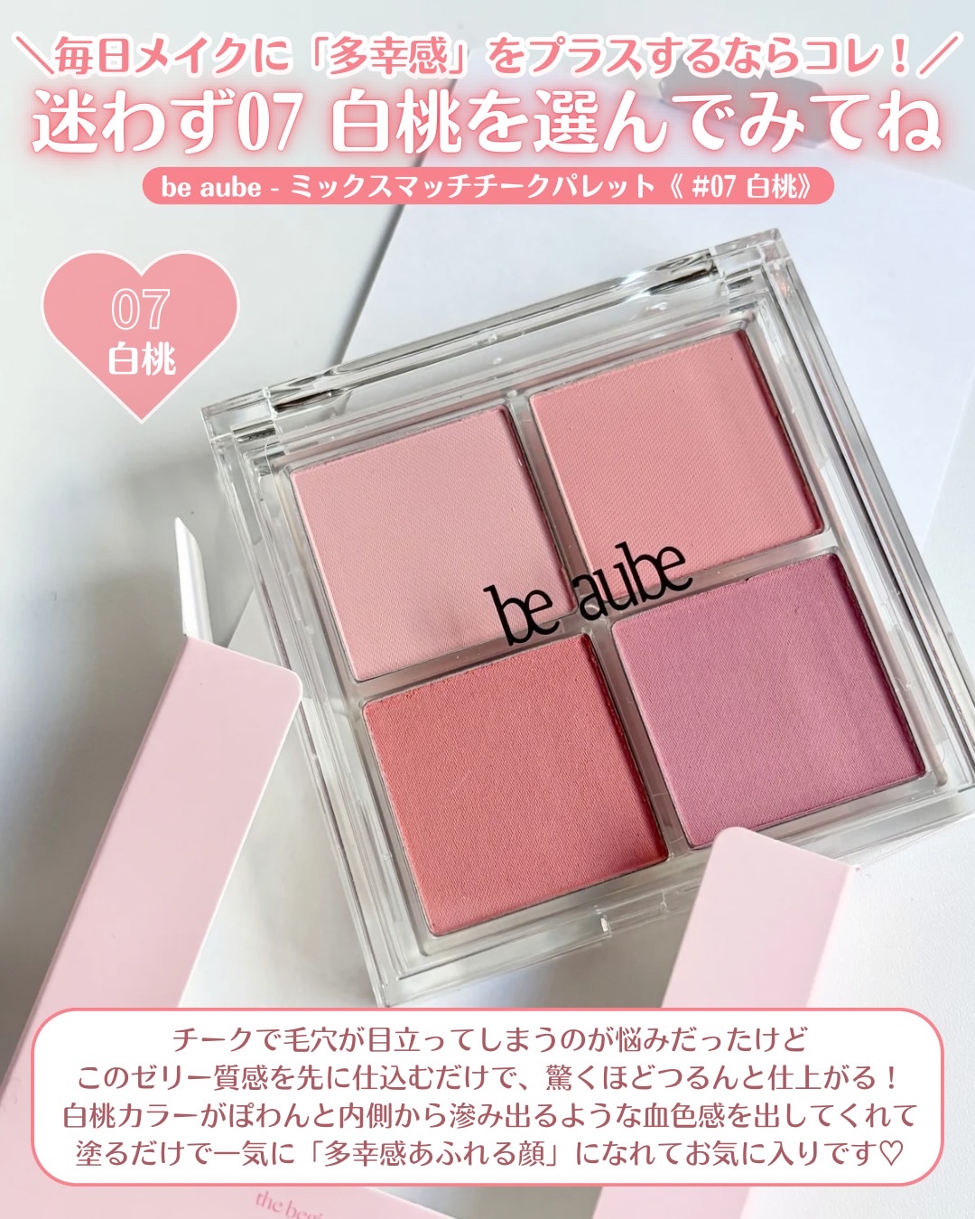 beaube・ビオブ ミックスマッチチークパレット07白桃硬めの白桃からインスピレーションを受けた、クールピンクのチークパレット白く引き締まった白桃のように落ち着いてほんのりとした血色感と透明感をプラスしてくれるカラー✔️4つのカラーを、好み...