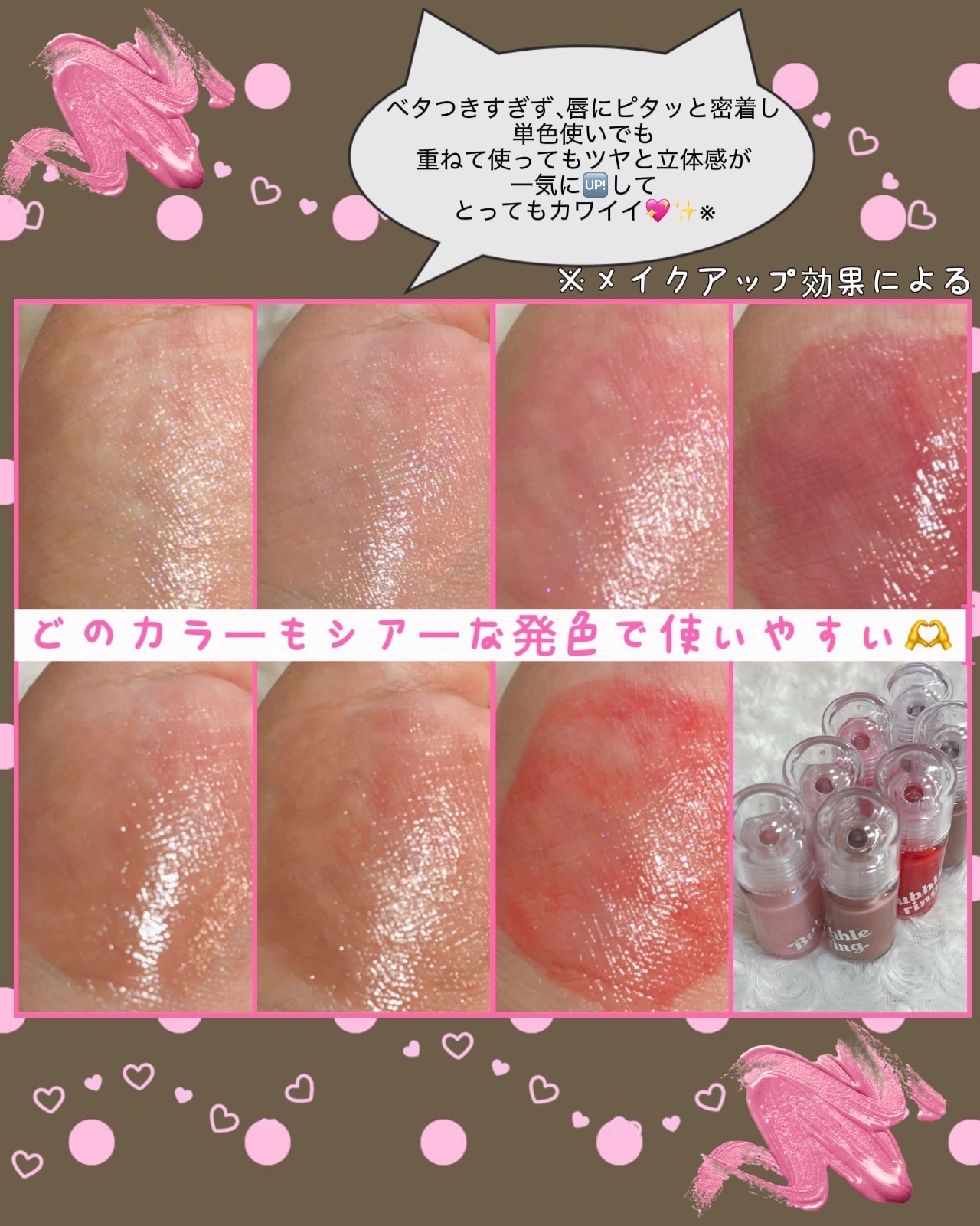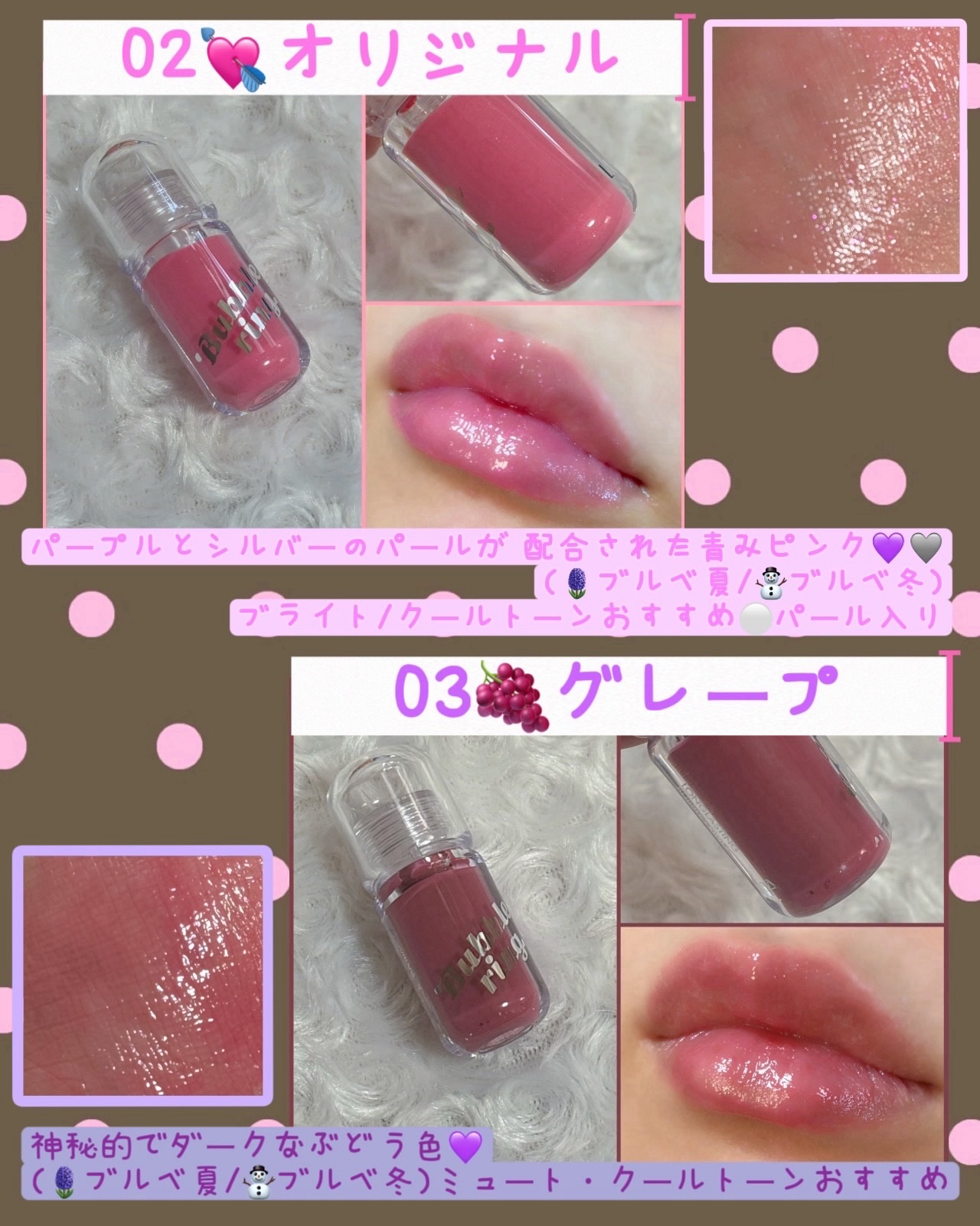 - ✔まるでフーセン!ビックチップで一気に盛れる #バブリンググロス ビックサイズのチップで、一度のタッチでも唇にフィットします。 重ね塗り不要で、お直しも簡単に。 ✔まるでガム!高密着で長続きする #ピタッとフィットグロス もちっとしたテクスチャーが唇に密着するため、飲んでも食べても落ちにくいロングラスティングタイプのグロス。 ✔ビビッドなカラーにラメをプラス #プレイラメグロス フーセンガムの味を連想させるカラー展開にラメをプラス。複数の色を重ねてカスタイマイズもできる遊び心たっぷりの唇で味わうチューインカラーフレーバー。