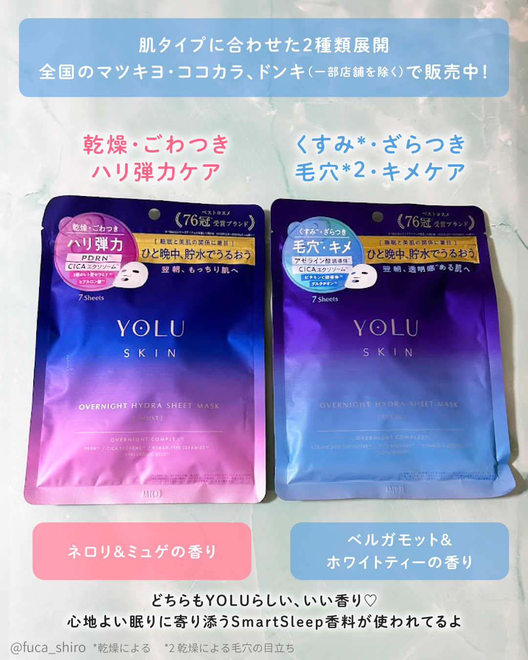 YOLUSKINからシートマスク誕生🌙*゚\ひと晩中、集中貯水/🤍YOLUSKINオーバーナイト ハイドラシートマスクモイスト 880円(税込)/7枚入(エッセンス160mL)ネロリ&ミュゲの香り睡眠と美肌の関係に着目。✔️オーバーナイトコン...