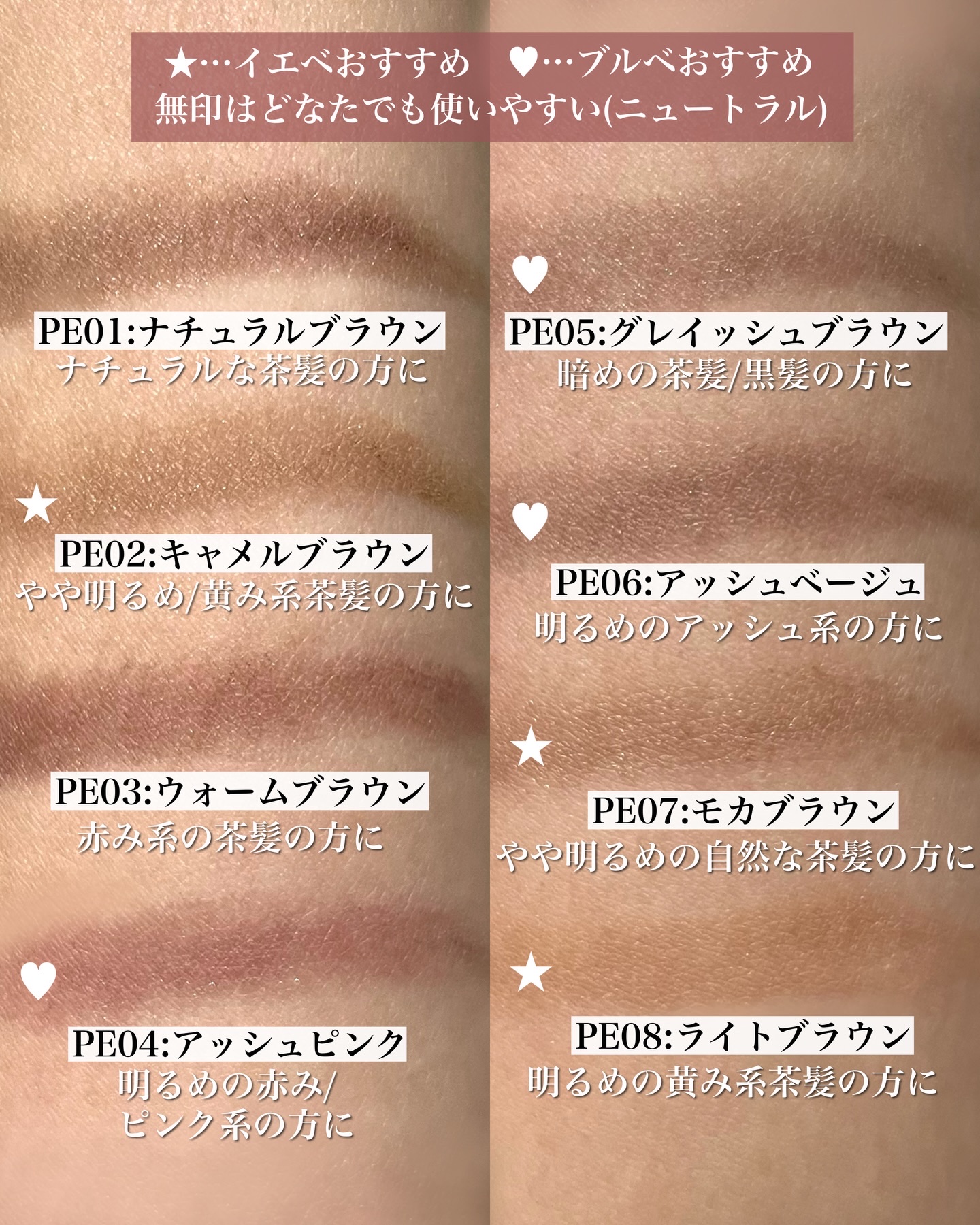 - <成分> 〈ペンシル〉ステアリン酸、モクロウ、ベヘン酸、水添ヒマシ油、トリエチルヘキサノイン、ダイマージリノール酸ダイマージリノレイルビス(ベヘニル/イソステアリル/フィトステリル)、ホホバエステル、トコフェロール、パンテノール、スクワラン、トリイソステアリン酸ポリグリセリル-2、水酸化Al、(+/-)グンジョウ、マイカ、酸化チタン、酸化鉄 〈パウダー〉タルク、トリイソステアリン、シリカ、ヒドロキシステアリン酸エチルヘキシル、テトラ(ヒドロキシステアリン酸/イソステアリン酸)ジペンタエリスリチル、トコフェロール、パンテノール、スクワラン、ステアリン酸Mg、セスキイソステアリン酸ソルビタン、ペンチレングリコール、水酸化Al、(+/-)グンジョウ、マイカ、酸化チタン、酸化鉄