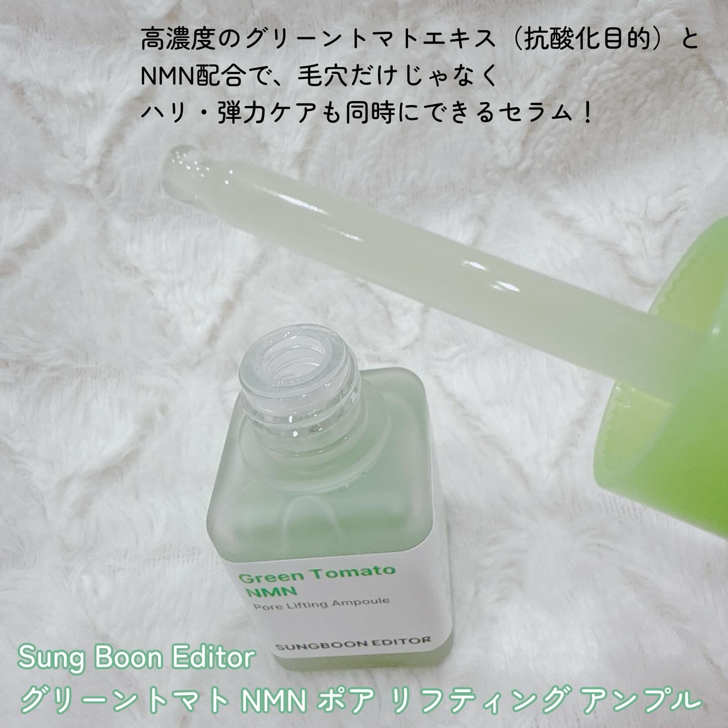 💚SungBoonEditorグリーントマトNMNポアリフティングアンプル40mlビタミンC※製品の抗酸化剤をたっぷり含む高濃度のグリーントマトエキスがたるみ毛穴をケアし、NMN配合でハリ・弾力をプラス✨初心者から上級者までおすすめ。毛穴...