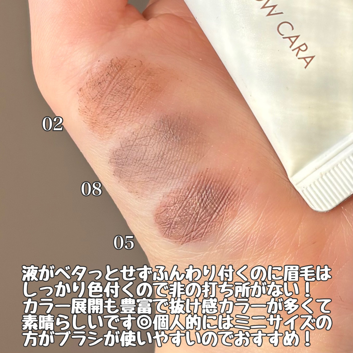 - さっとひと塗りで印象変わるブロウタッチ 1.なりたい眉カラーへ自然にムードチェンジ 2.眉本来の質感を生かし、流れを整え自然な立体感を演出 3.ムラなく仕上がり 1 本 1 本しっかり密着