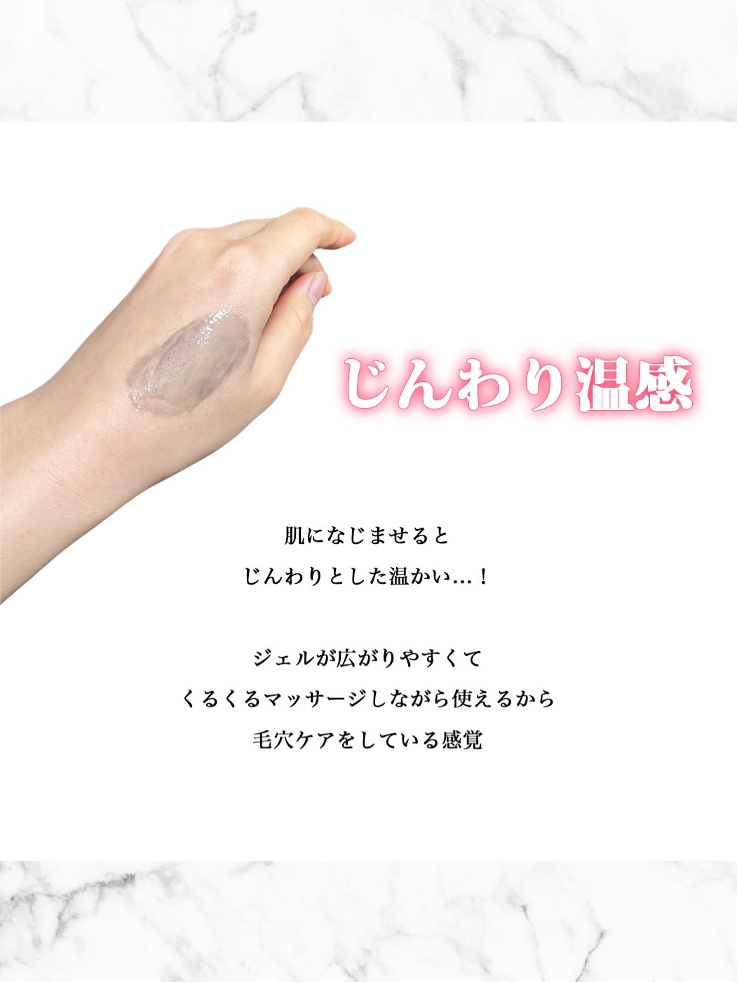 - じんわり温感×炭×クレイのトリプルアプローチで、まるで岩盤スチームをしたような肌体験ができる毛穴用ジェル洗顔 ●角栓除去アプローチシステム ・「温感ブースト処方」+角栓軟化成分「イソペンチルジオール」配合<角栓軟化> 角栓を柔らかくし、除去しやすい状態にします ・「ブラックリムーブ処方」<除去> Wの吸着成分「炭×クレイ*1」で余分な皮脂を吸着除去します *1:カオリン、ベントナイト ●美容保湿成分「生ビタミンC*2」、「グルタチオン」配合 *2:アスコルビン酸 ●8種の天然香料配合「リラックスピュアアロマの香り」 オレンジ油、コリアンダー果実油、マンダリンオレンジ果皮油、ユーカリ葉油、ライム油、ラベンダー油、レモン果皮油、ローマカミツレ花油 ●パッチテスト済み (すべての方に皮フ刺激が起こらないということではありません) ●7つの無添加 アルコール・パラベン・シリコン・鉱物油・合成香料・合成着色料・紫外線吸収剤を無添加 ●ご使用方法 ・週1、2回を目安にご使用ください。(朝夜どちらでもお使いいただけます) ・洗顔の後に顔の水を拭き取ってからご使用ください。 (顔が濡れていても使用できますが、温感を感じにくくなる場合があります) ・適量(直径2cmくらい)を鼻や眉間、あごなどの毛穴汚れが気になる部分にのせます。くるくると円を描くようにジェルをしっかりなじませます。その後、良く洗い流します。 なじませる際、肌を強くこすりすぎないようにご注意ください。 ※使用する環境(温度・湿度等)や個人差により、温感の感じ方が異なることがあります。
