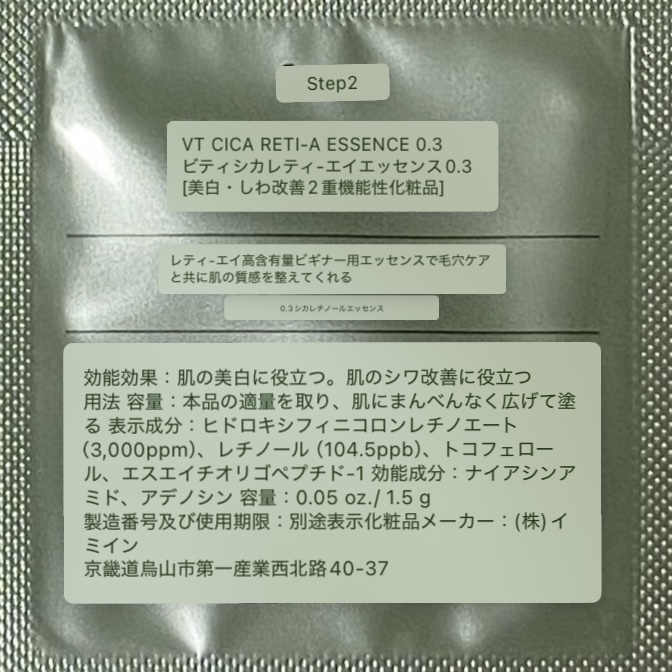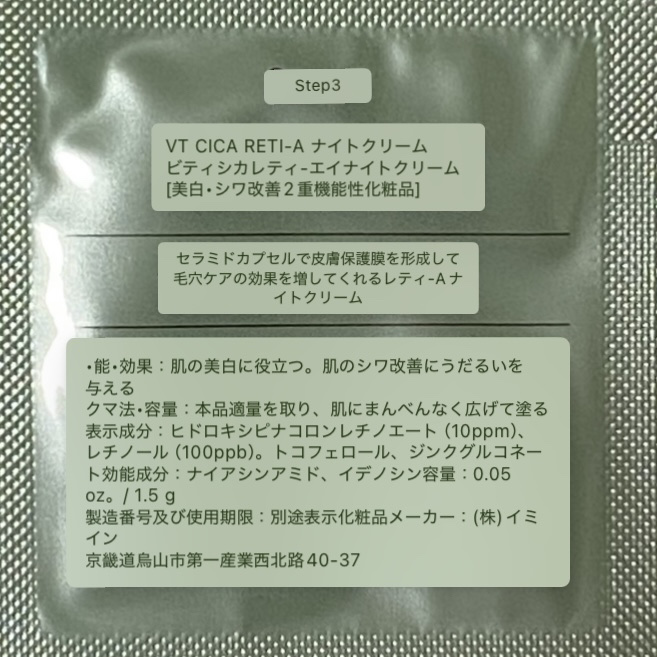 - STEP1 シカレチA ファーストマスク 水、グリセリン、プロパンジオール、ナイアシンアミド、1,2-ヘキサンジオール、シア脂、ポリアクリル酸Na、水添レシチン、水添ポリデセン、ステアリン酸ポリグリセリル-10、カプリリルグリコール、アデノシン、エチルヘキシルグリセリン、ヒドロキシアセトフェノン、EDTA-2Na、BG、トリデセス-6、メリアアザジラクタ葉エキス、(C11-13)イソパラフィン、ヒアルロン酸Na、ツボクサエキス、メリアアザジラクタ花エキス、バクチオール、ジメチルイソソルバイド、加水分解エラスチン、レチノイン酸ヒドロキシピナコロン、コラーゲンエキス、レシチン、ポリソルベート20、レチノール、アシアチコシド、アシアチン酸、マデカッソシド、マデカシン酸、プロポリスエキス、香料 STEP2 シカレチA エッセンス0.3 水、BG、水添ポリ(C6-14オレフィン)、ジメチルイソソルバイド、1,2-ヘキサンジオール、ナイアシンアミド、エチルヘキサン酸セチル、テトラエチルヘキサン酸ペンタエリスリチル、ステアリン酸グリセリル、ジステアリン酸ポリグリセリル-3メチルグルコース、ベヘニルアルコール、水添野菜油、ジメチコン、ステアリン酸ポリグリセリル-6、レチノイン酸ヒドロキシピナコロン、ステアリン酸、セテアリルアルコール、ポリアクリレート-13、カルボマー、ベタイン、パンテノール、トロメタミン、ポリイソブテン、エチルヘキシルグリセリン、ツボクサエキス、ベヘン酸ポリグリセリル-6、アデノシン、ヒアルロン酸Na、アラントイン、EDTA-2Na、ポリソルベート20、ワサビノキ種子エキス、グルコノラクトン、バクチオール、カプリロイルサリチル酸、イソステアリン酸ソルビタン、ヒドロキシステアリン酸、セラミドNP、トコフェロール、アスコルビン酸、ペンチレングリコール、レチノール、レシチン、カプリリルグリコール、リン酸Na、トレハロース、BHT、アセチルヘキサペプチド-8、プロポリスエキス、マデカッソシド、アシアチコシド、アシアチン酸、マデカシン酸、BHA、合成ヒト遺伝子組換オリゴペプチド-1、合成ヒト遺伝子組換ポリペプチド-1、香料 STEP3 シカレチA ナイトクリーム 水、BG、グリセリン、トリ(カプリル酸/カプリン酸)グリセリル、プロパンジオール、アラキジルアルコール、トリエチルヘキサノイン、1,2-ヘキサンジオール、ナイアシンアミド、シクロヘキサシロキサン、エチルヘキサン酸セチル、フェニルトリメチコン、テトラエチルヘキサン酸ペンタエリスリチル、安息香酸アルキル(C12-15)、水添ポリ(C6-14オレフィン)、ベヘニルアルコール、マンニトール、ステアリン酸、パルミチン酸、アラキジルグルコシド、ビニルジメチコン、(アクリル酸ヒドロキシエチル/アクリロイルジメチルタウリンNa)コポリマー、水添オリーブ油ラウリルエステルズ、エチルヘキシルグリセリン、カルボマー、アデノシン、トロメタミン、オリーブ油脂肪酸ソルビタン、セラミドNP、EDTA-2Na、水添レシチン、ヒアルロン酸Na、バクチオール、ジメチルイソソルバイド、ツボクサエキス、レチノイン酸ヒドロキシピナコロン、オウレン根エキス、パンテノール、トコフェロール、セテアリルアルコール、ダイズ油、ペンチレングリコール、アスパラギン酸Mg、グルコン酸亜鉛、パントラクトン、レチノール、フィトスフィンゴシン、グルコン酸銅、コレステロール、セラミドEOP、セラミドAP、セラミドNS、プロポリスエキス、マデカッソシド、アシアチコシド、アシアチン酸、マデカシン酸、香料