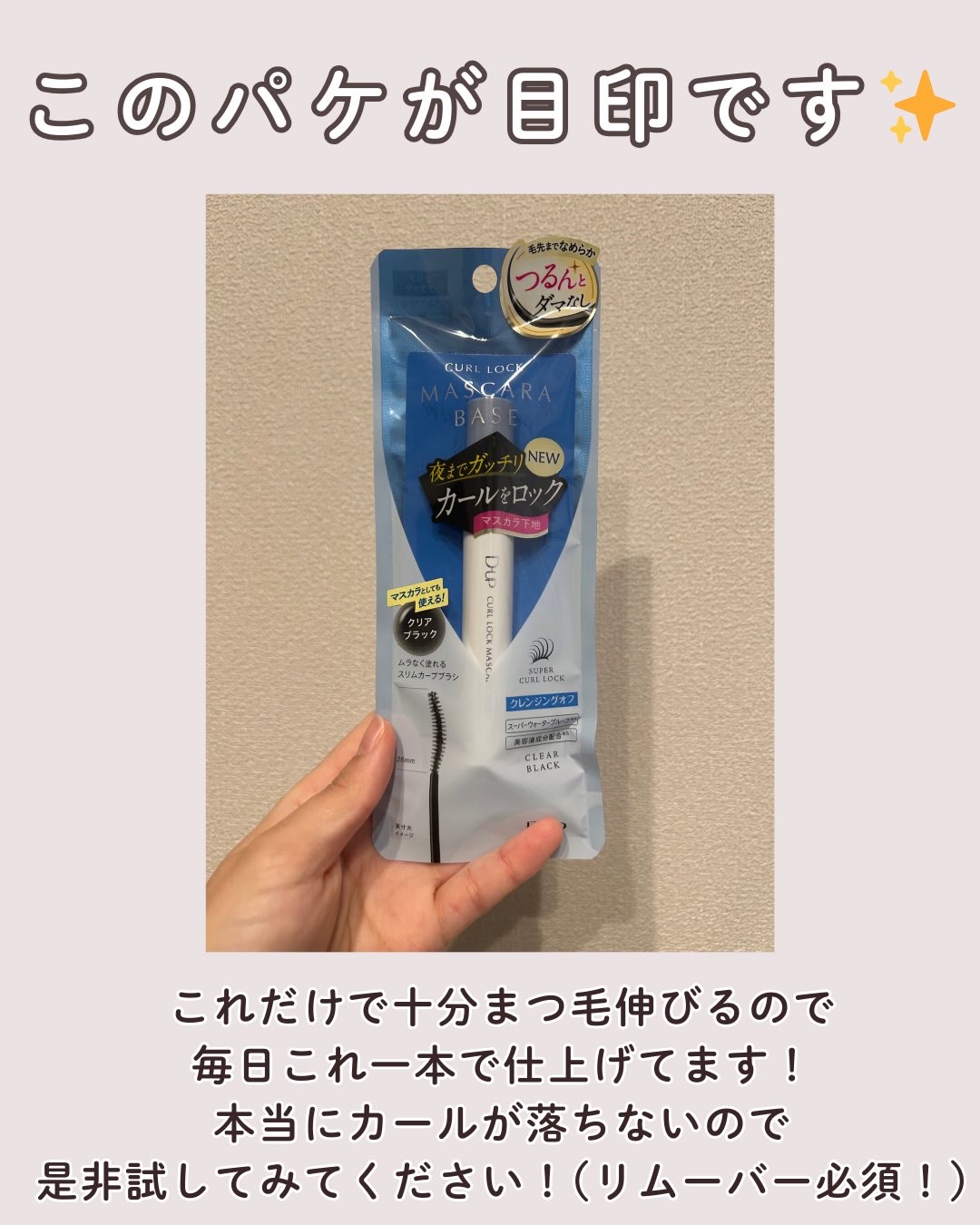 カールロックしながらダマのない美しい仕上がりにこだわったマスカラベース。つるんと滑らかな塗り心地と仕上がり。 透明感のあるシアーブラックカラー。少しカーブのあるブラシがフィットして塗りやすい。 カールしていないまつ毛もしっかりとカールがキープされ落ちてこなかった!!