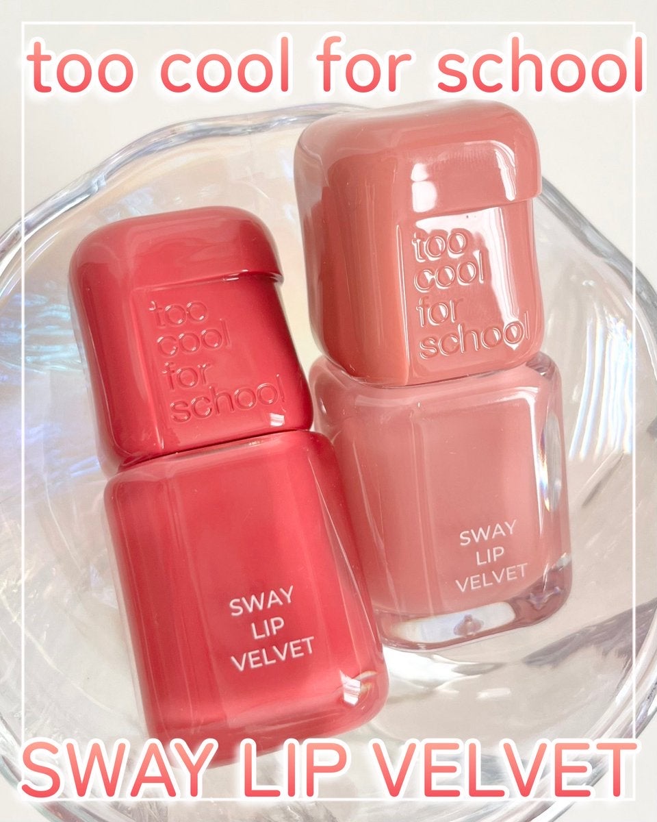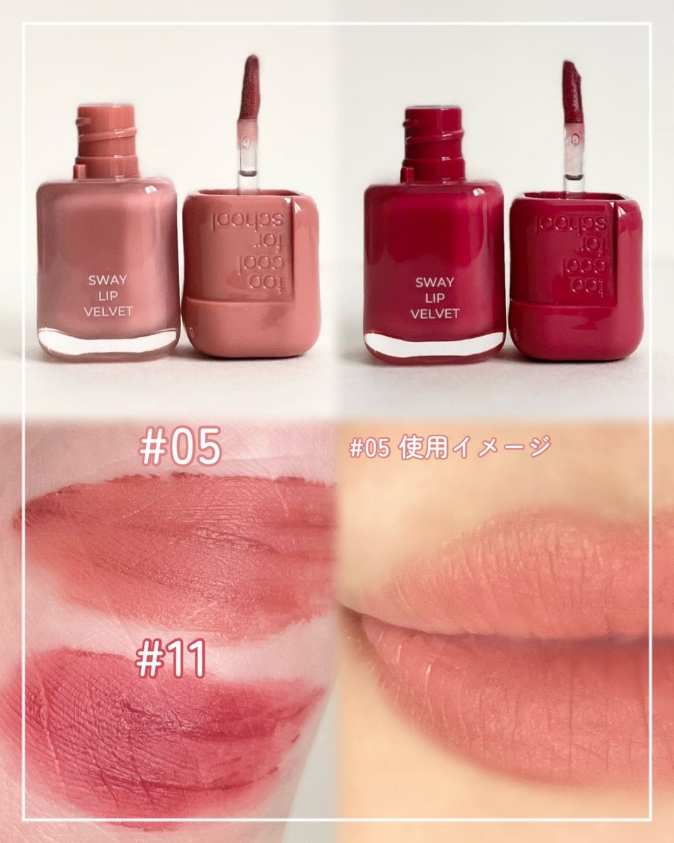 toocoolforschoolスウェイリップベルベットベルベットのようなふんわりマットな質感で、ベタつき感がないので冬のメイクにぴったり🥹💖プライミングゲル*¹が配合されているので、唇の気になるしわもなめらかにカバー*²してくれて、均一でふ...