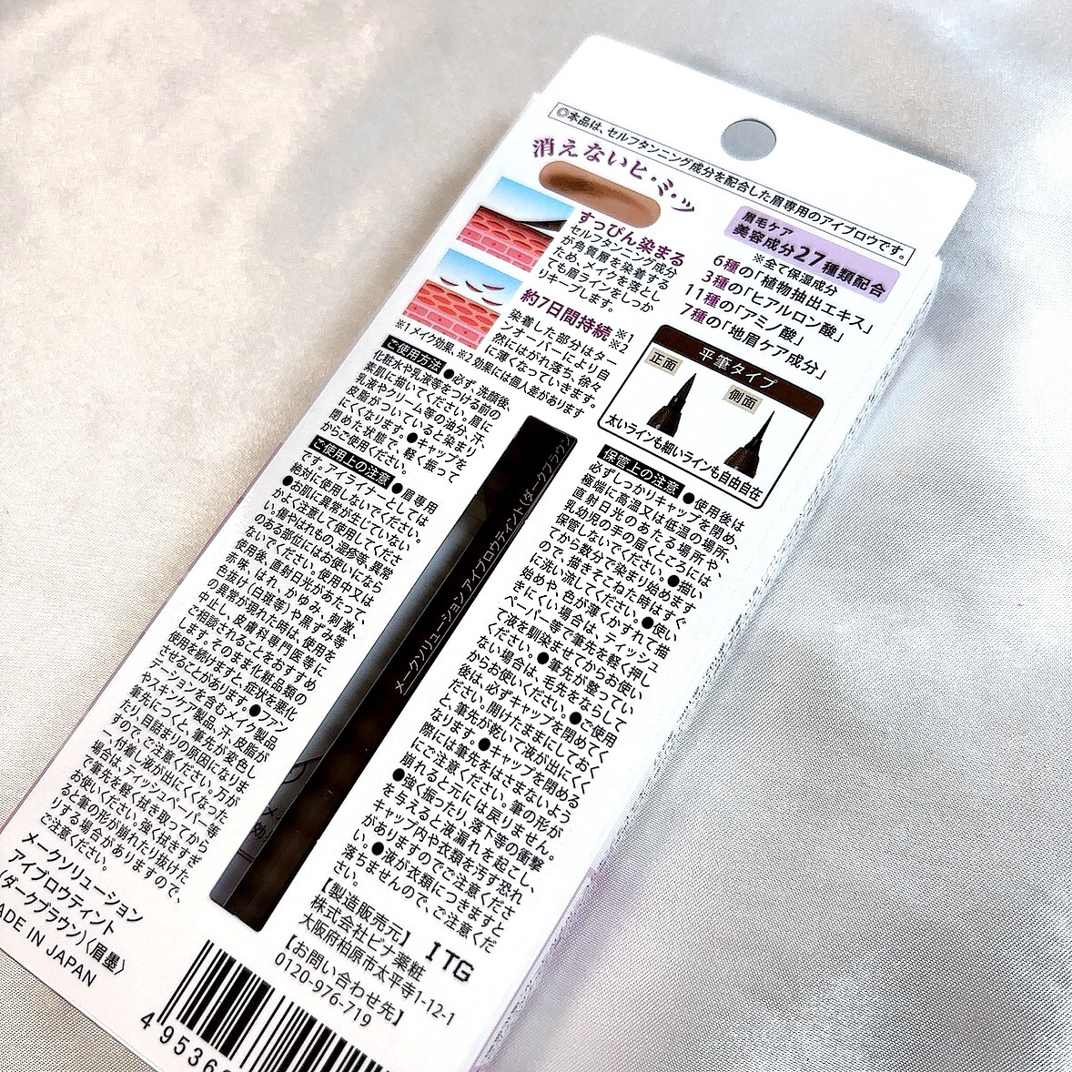 - ●眉ティント。セルフタンニング成分(ジヒドロキシアセトン)が肌表面の角質層と反応することにより、肌が色づきます。肌が色づいているので、汗や水に強く、メイクを落としても眉ラインをキープできます。個人差はありますが、3~7日間色づきます。色づき効果は、肌のターンオーバー(皮膚の生まれ変わり)により、自然にはがれ落ち、徐々に薄くなっていきます。 ●27種類の美容成分配合(6種の植物抽出エキス、3種のヒアルロン酸、11種のアミノ酸、7種の地眉ケア成分)。※全て保湿成分 ●平筆タイプ。太いラインも細いラインも自由自在。コシのある筆先で、書き心地も滑らか。
