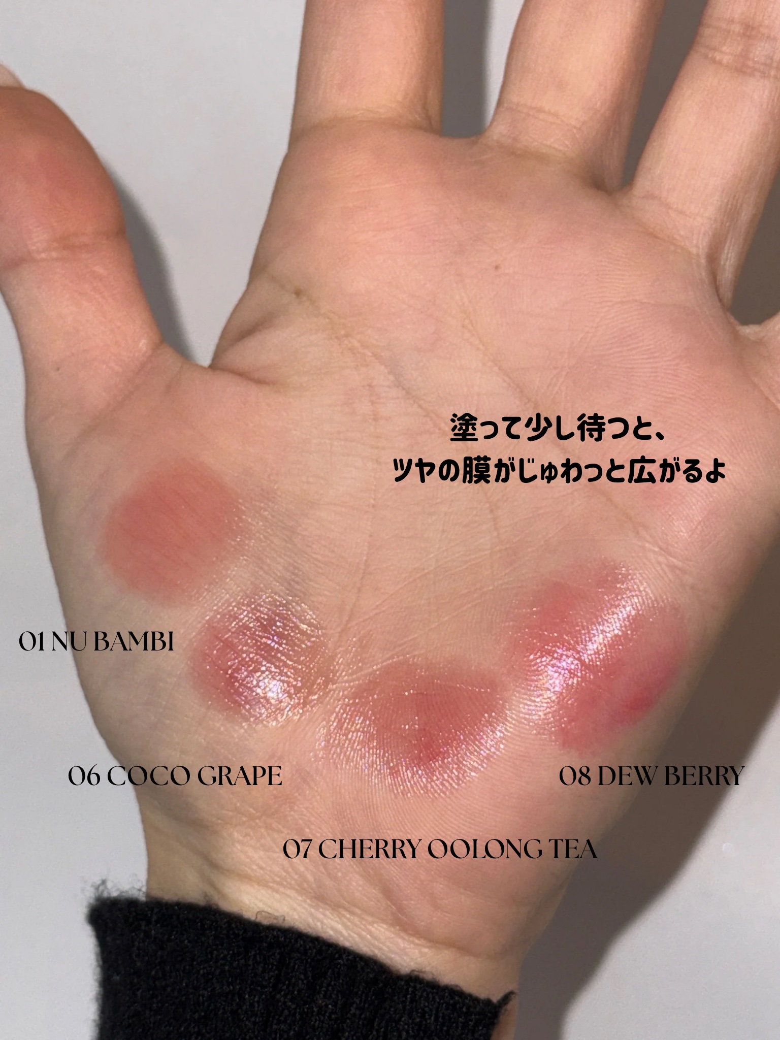 ⁑じゅわっと重ねるほどふっくら広がる上品なツヤ感を演出✨ベタつかず軽やかな仕上がりうるおいのある透けツヤテクスチャー私が使っているのは01ヌバンビ同シリーズの中でも韓国で人気カラー💗単品使いはもちろん!ベースカラーとしても使える!色移りしにく...