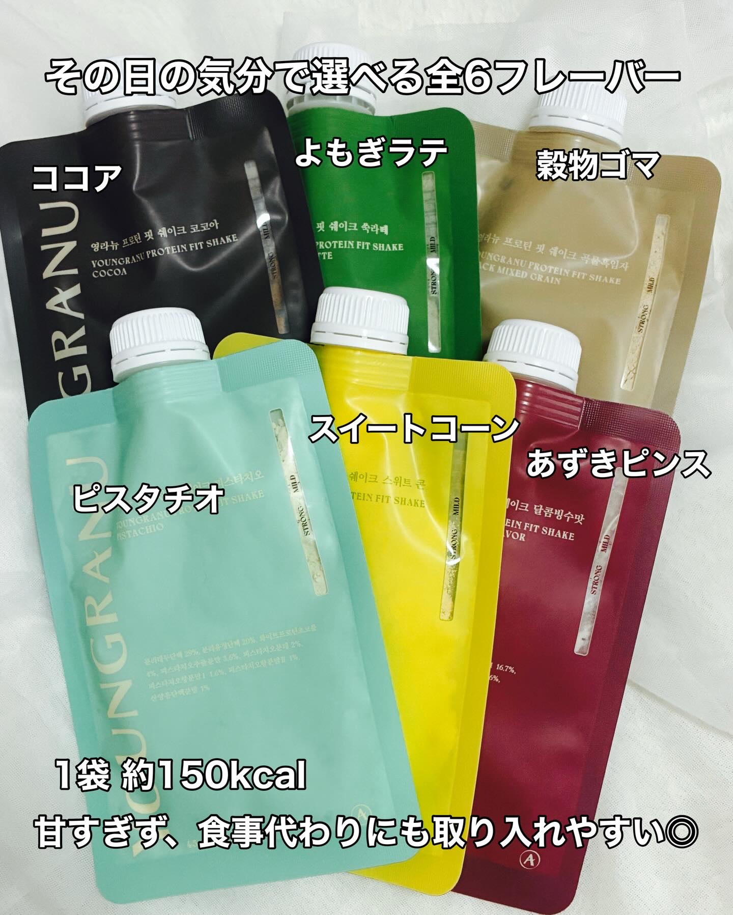 🏷︎⸝⋆PR美味しくヨンラニューチャレンジ🥤𓈒𓂂𓏸YOUNGRANUプロテインフィットシェイク🥤あずきピンス・穀物黒ゴマ・よもぎラテ・ピスタチオ・ココア・スイートコーンの全6種類水や牛乳、豆乳を目盛...