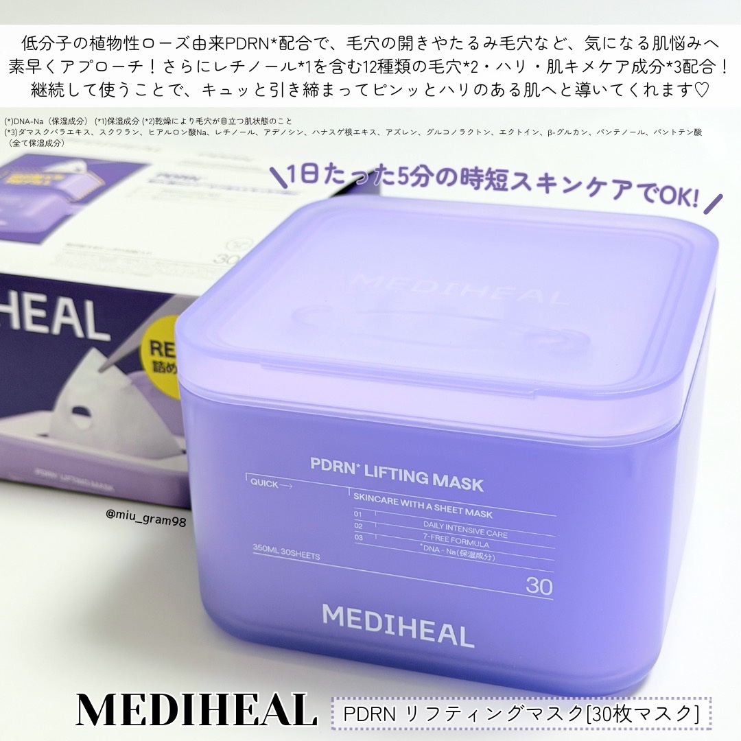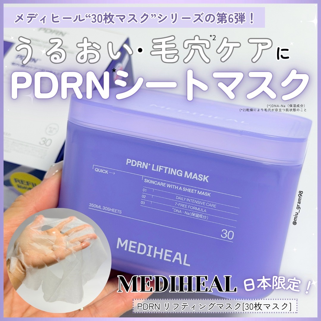 MEDIHEAL💜*・\冬の乾燥対策に時短スキンケア❄️/PDRNリフティングマスク[30枚入り]▼ご提供@mediheal_jp▼𝐈𝐓𝐄𝐌𝐃𝐄𝐒𝐂𝐑𝐈𝐏𝐓𝐈𝐎𝐍𝐑𝐄𝐕𝐈𝐄𝐖︎︎︎︎☑︎低分子イギリス産ローズPDRN*高純度のPDRN*配合︎...