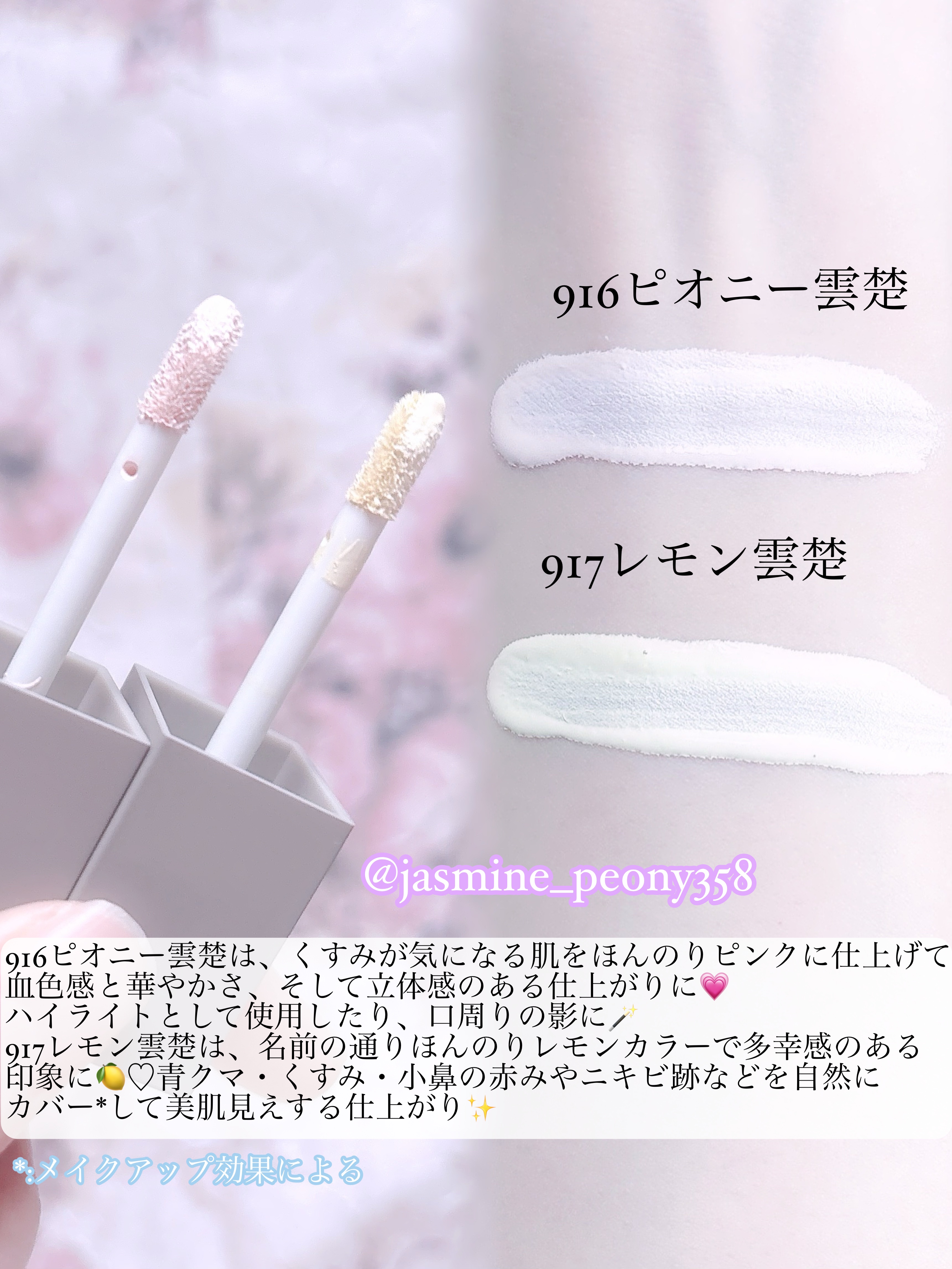 Dinto☁️⸝⸝꙳ライトベールカラーコレクター916ピオニー雲楚🌸917レモン雲楚🍋・みずみずしいテクスチャ・少量でも伸びが良い・微細粒子でムラなく密着して持ちがよい・厚塗り感がない916ピオニー雲楚🌸・くすみをピンクの補色で自然にトーンア...