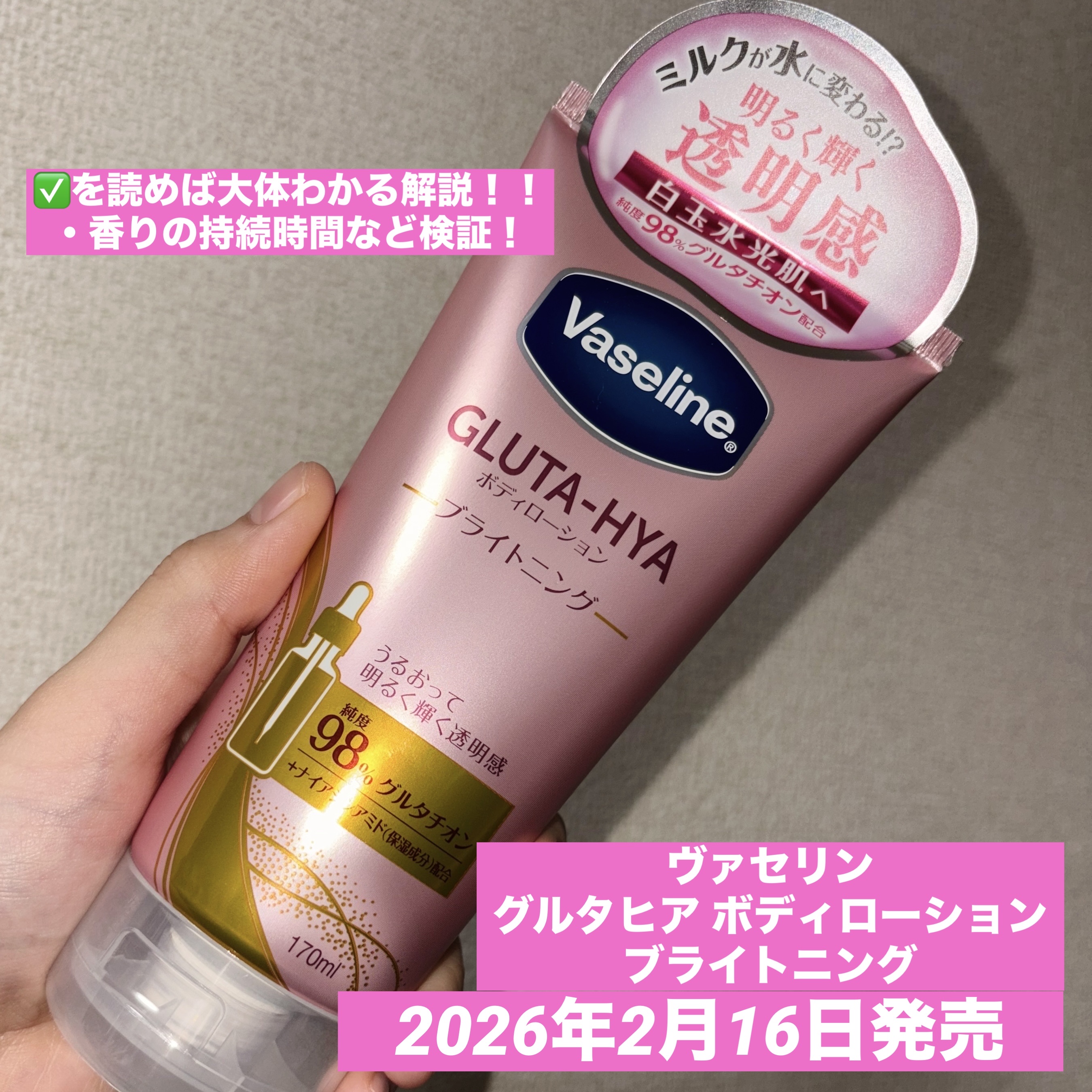 ヴァセリンGLUTA-HYA(グルタヒア)ボディローション ブライトニング海外の方ではすでに発売されてたみたいですね。日本では2月に発売予定。グルタチオン、ヒアルロン酸、ナイアシンアミドなど、こだわりの保湿成分配合。うるおって明るく輝...