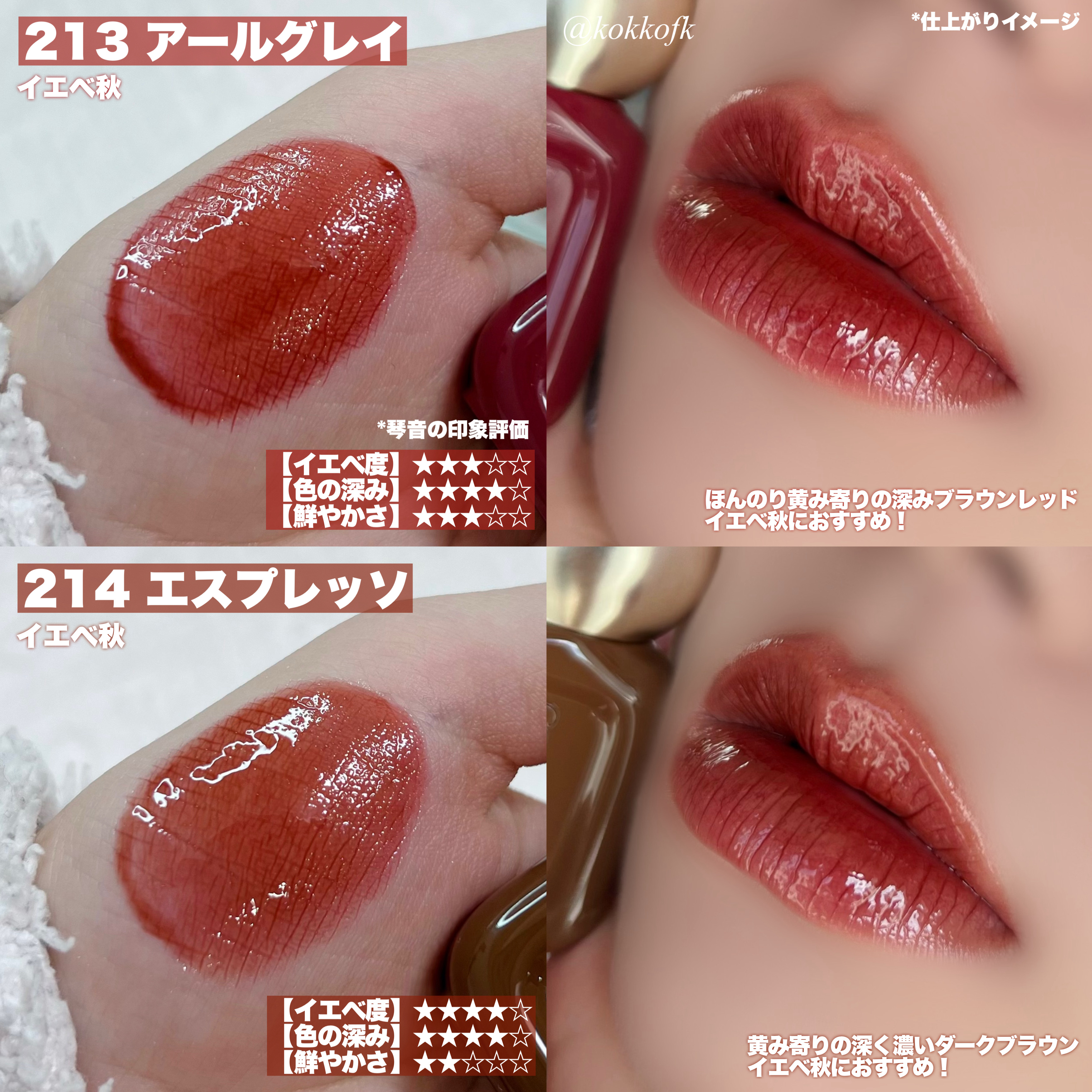 既存のジューシーラスティングティントよりさらに軽いツヤ感が魅力の新作ティント! 色選びの参考にしてね! やや黄みの明るいオレンジコーラル鮮やか得意なイエベ春におすすめ! 黄みの明るくまろやかなオレンジベージュ黄みが得意なイエベ春におすすめ! 青み黄み中間なくすみピンクベージュブルベ夏やイエベ春におすすめ 黄みの深くて鮮やかなオレンジレッド鮮やか得意なイエベ秋におすすめ! 青みの鮮やかで明るいビビッドピンク明るさ得意なブルベ冬やブルベ夏におすすめ! 青みの明るめで柔らかいローズピンクブルベ夏やブルベ冬におすすめ! 青み黄み中間な鮮やかで強いビビッドレッド2ndイエベ春のブルベ冬におすすめ! 青みの強い深くて鮮やかなベリーレッド2nd夏で鮮やか得意なブルベ冬におすすめ!