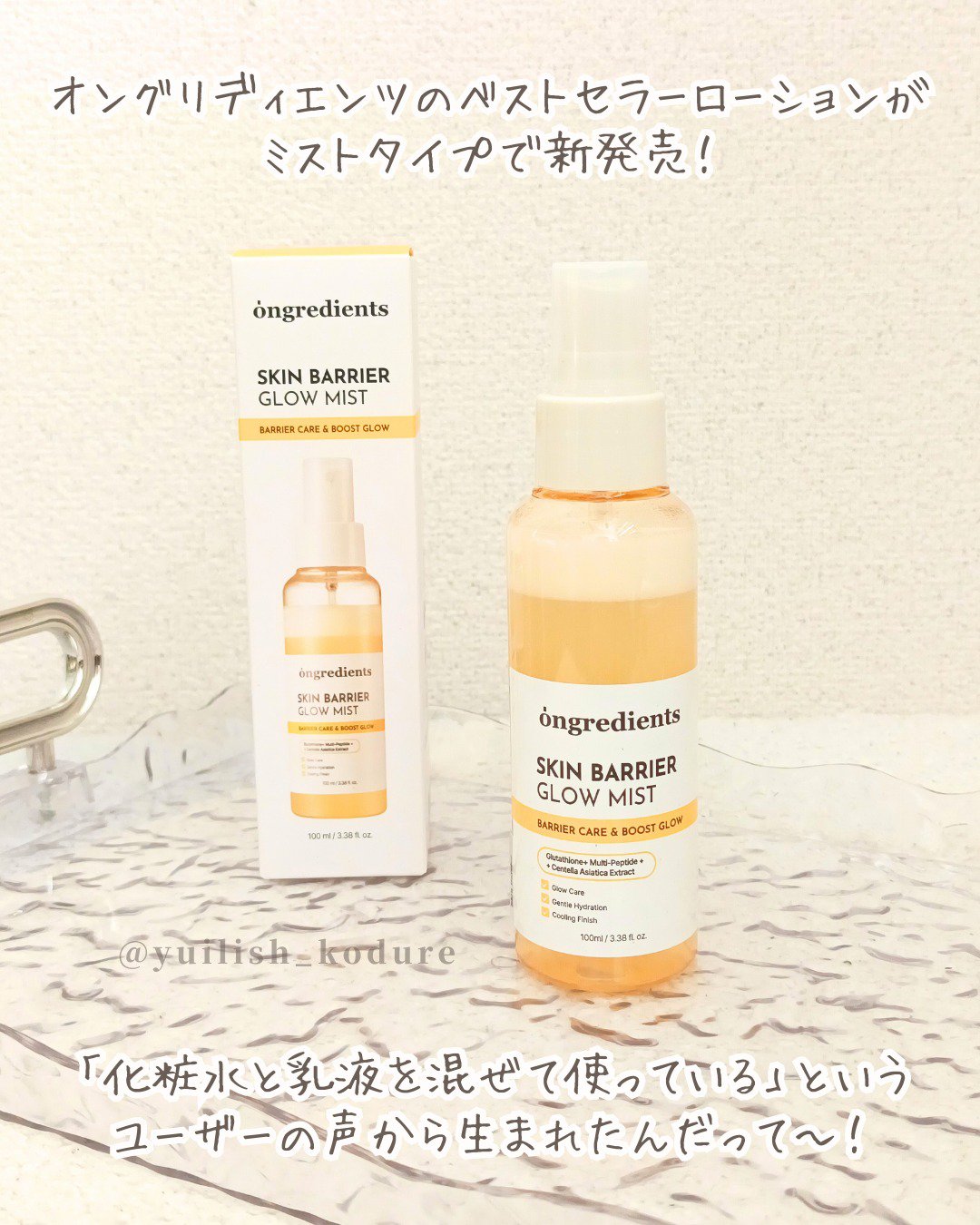 - 「ongredients(オングリディエンツ)」が、ついに日本のオフライン店舗に登場! <2025年8月30日(土)(*1)より全国のプラザ、ドン・キホーテ(*2)にて先行販売を開始> 水光トナーと水分グロウ(ツヤ)成分が融合し、まるでハイライトを施したようなツヤ肌ミストを実現 【主要成分】 ・ツボクサ葉エキス(*3) 乾燥などの外的刺激を受けた肌を整え、肌バリア(*4)機能を守ります。 ・複合ペプチド(*5) 肌のコンディションを整え、ハリのある肌印象へと導きます。 ・ヒアルロン酸(*6)&パンテノール(*7) 乾燥した肌を保湿ししっとり健やかに保ちます。 【こんな方におすすめ】 ・外的刺激により乾燥で肌がゆらぐのが気になる方 ・保湿とキメのダブルケアをしたい方 ・メイクの上からでも!外出先でも、肌にうるおいを与えたい方 (*1)店頭開始日となり、購入可能日は各店舗により異なります。 (*2)一部店舗を除きます。 (*3)整肌成分 (*4)角質層のうるおいを保つこと (*5)トリペプチド-1銅,トリペプチド-1,パルミトイルトリペプチド-1,パルミトイルペンタペプチド-4,ヘキサペプチド-11,ヘキサペプチド-9 (*6)ヒアルロン酸Na,ヒアルロン酸クロスポリマーNa,ヒアルロン酸K,ヒアルロン酸ヒドロキシプロピルトリモニウム,加水分解ヒアルロン酸Na,加水分解ヒアルロン酸,ヒアルロン酸(保湿成分) (*7)保湿成分