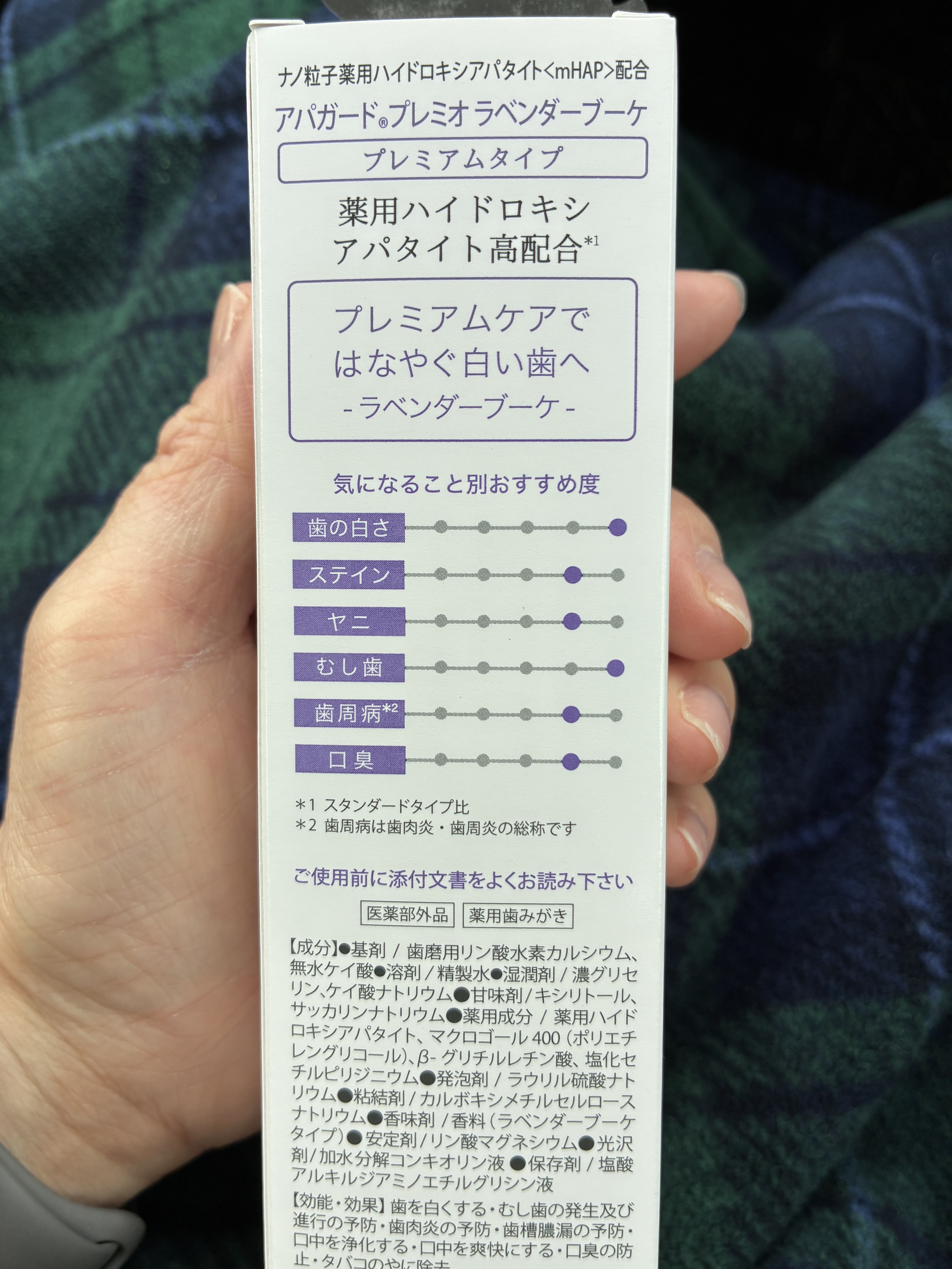 - <エクストラミント> 【原材料・成分】●基剤/歯磨用リン酸水素カルシウム、無水ケイ酸●溶剤/精製水●湿潤剤/濃グリセリン、ケイ酸ナトリウム●甘味剤/キシリトール、サッカリンナトリウム●薬用成分/薬用ハイドロキシアパタイト、マクロゴール400(ポリエチレングリコール)、β-グリチルレチン酸、塩化セチルピリジニウム●発泡剤/ラウリル硫酸ナトリウム●粘結剤/カルボキシメチルセルロースナトリウム●香味剤/香料(エクストラミントタイプ)●安定剤/リン酸マグネシウム●光沢剤/加水分解コンキオリン液●保存剤/塩酸アルキルジアミノエチルグリシン <ライトミント> 【原材料・成分】●基剤/歯磨用リン酸水素カルシウム、無水ケイ酸●溶剤/精製水●湿潤剤/濃グリセリン、ケイ酸ナトリウム●甘味剤/キシリトール、サッカリンナトリウム●薬用成分/薬用ハイドロキシアパタイト、マクロゴール400(ポリエチレングリコール)、β-グリチルレチン酸、塩化セチルピリジニウム●発泡剤/ラウリル硫酸ナトリウム●粘結剤/カルボキシメチルセルロースナトリウム ●香味剤/香料(ライトミントタイプ)●安定剤/リン酸マグネシウム●光沢剤/加水分解コンキオリン液●保存剤/塩酸アルキルジアミノエチルグリシン <ラベンダーブーケ > 歯磨用リン酸水素カルシウム、無水ケイ酸、精製水、濃グリセリン、ケイ酸ナトリウム、キシリトール、サッカリンナトリウム、薬用ハイドロキシアパタイト、β-グルチルレチン酸、塩化セチルピリジニウム、ラウリル硫酸ナトリウム、ラウロイルサルコシンナトリウム、カルボキシメチルセルロースナトリウム、香料(ダブルミントタイプ)、リン酸マグネシウム、塩酸アルキルジアミノエチルグリシン