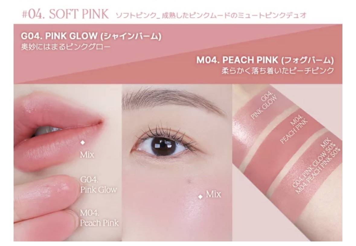 - ‘14 COLOR X 2 TEXTURE’ミキシングで完成する無限な カラースペクトラム、カラーとテクスチャーを自由に カストマイズして毎日違うMOOD 演出! リップ, チーク, 鼻筋, シャドウ, 顎, こめかみ そして ボディまで使える。 ブレンドと密着にこだわったグロッシーな ‘シャインバームテクスチャー’ とソフトな‘フォグバームテクスチャー’ がどの部位にも簡単にブレンドされ、しっかり密着される。